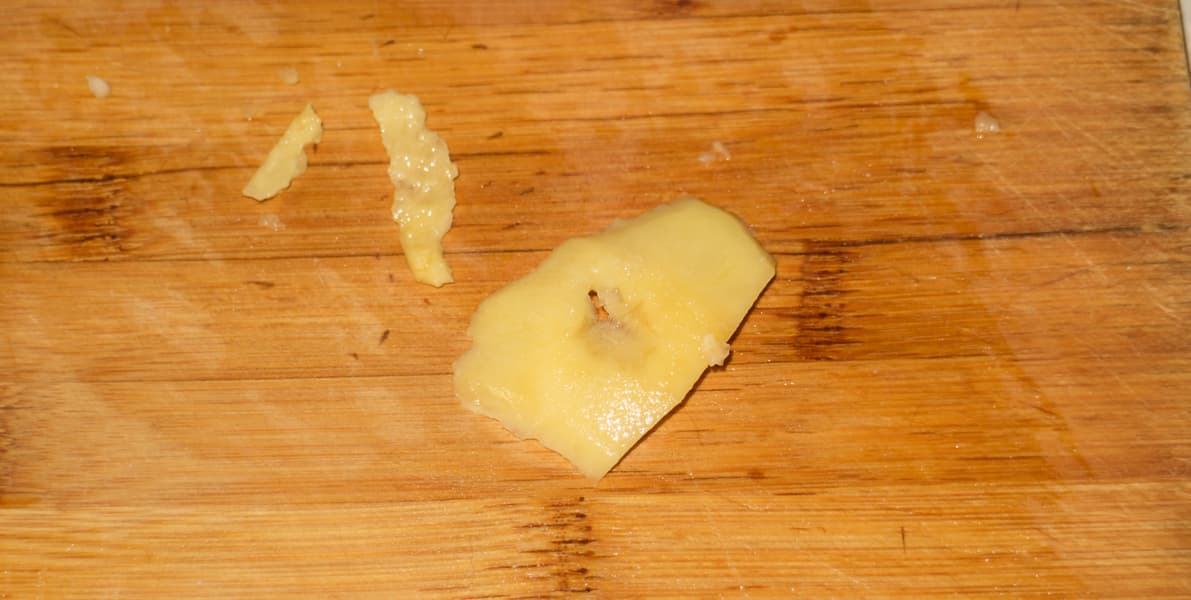 При этом отходов в виде непрорезанных фрагментов продуктов практически нет — мы обнаружили с внешней стороны конуса лишь один относительно крупный кусочек картофеля. Ломтик тонкий, так что мы просто нашинковали его и добавили в массу к остальным овощам.