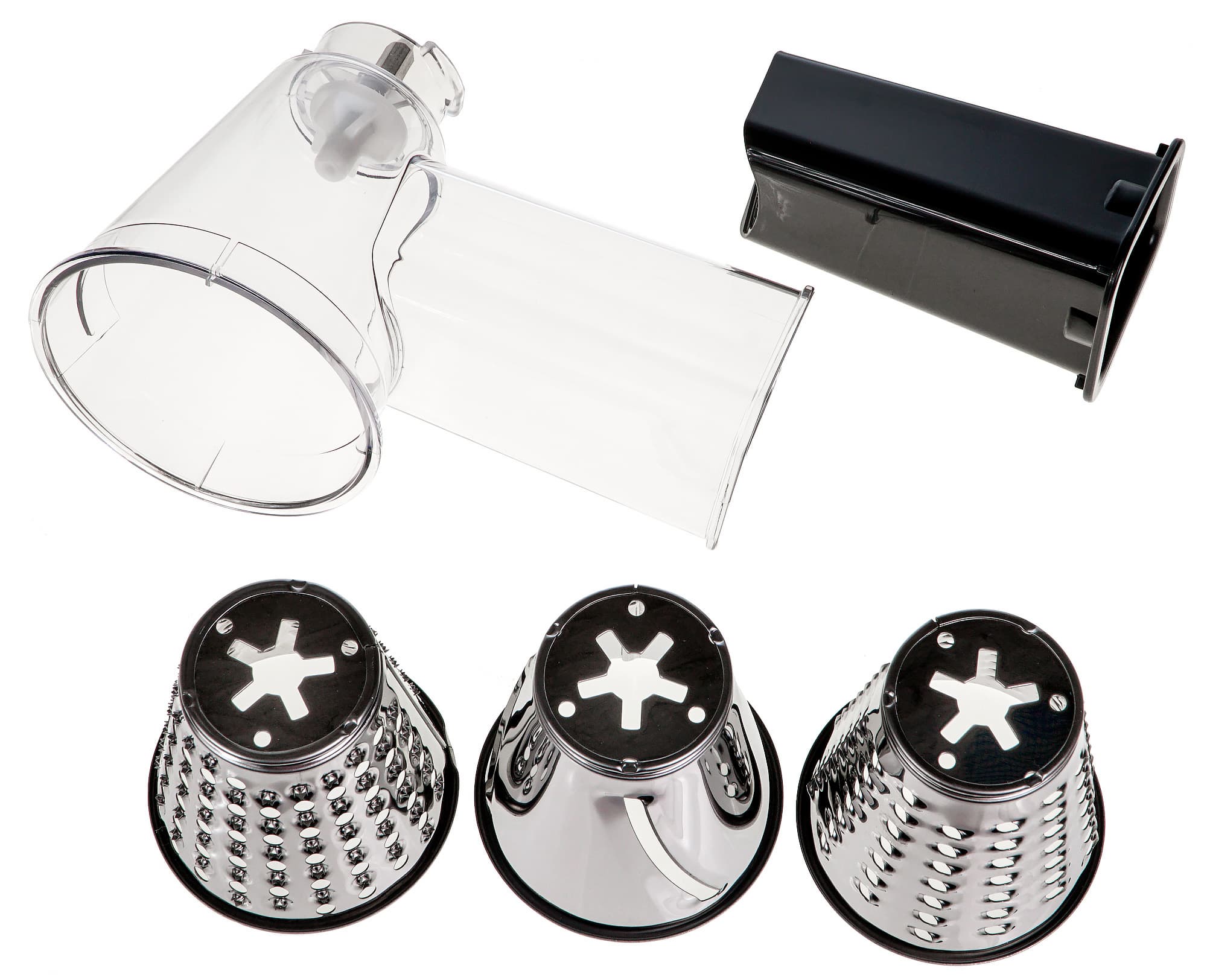 Далее рассмотрим насадку-овощерезку, которая представляет собой корпус, изготовленный из прозрачного пластика, и вставляемый внутрь цельнометаллический конус с режущими элементами. Диаметр конуса в широкой части — 8 см. Загрузочная горловина выполнена в форме трапеции, самая узкая сторона которой составляет 4 см, основание 5,5 см, высота 6 см. На первый взгляд величина отверстия кажется достаточной для переработки некоторых овощей без предварительного разрезания. Насадка оснащена отдельным пластиковым толкателем.