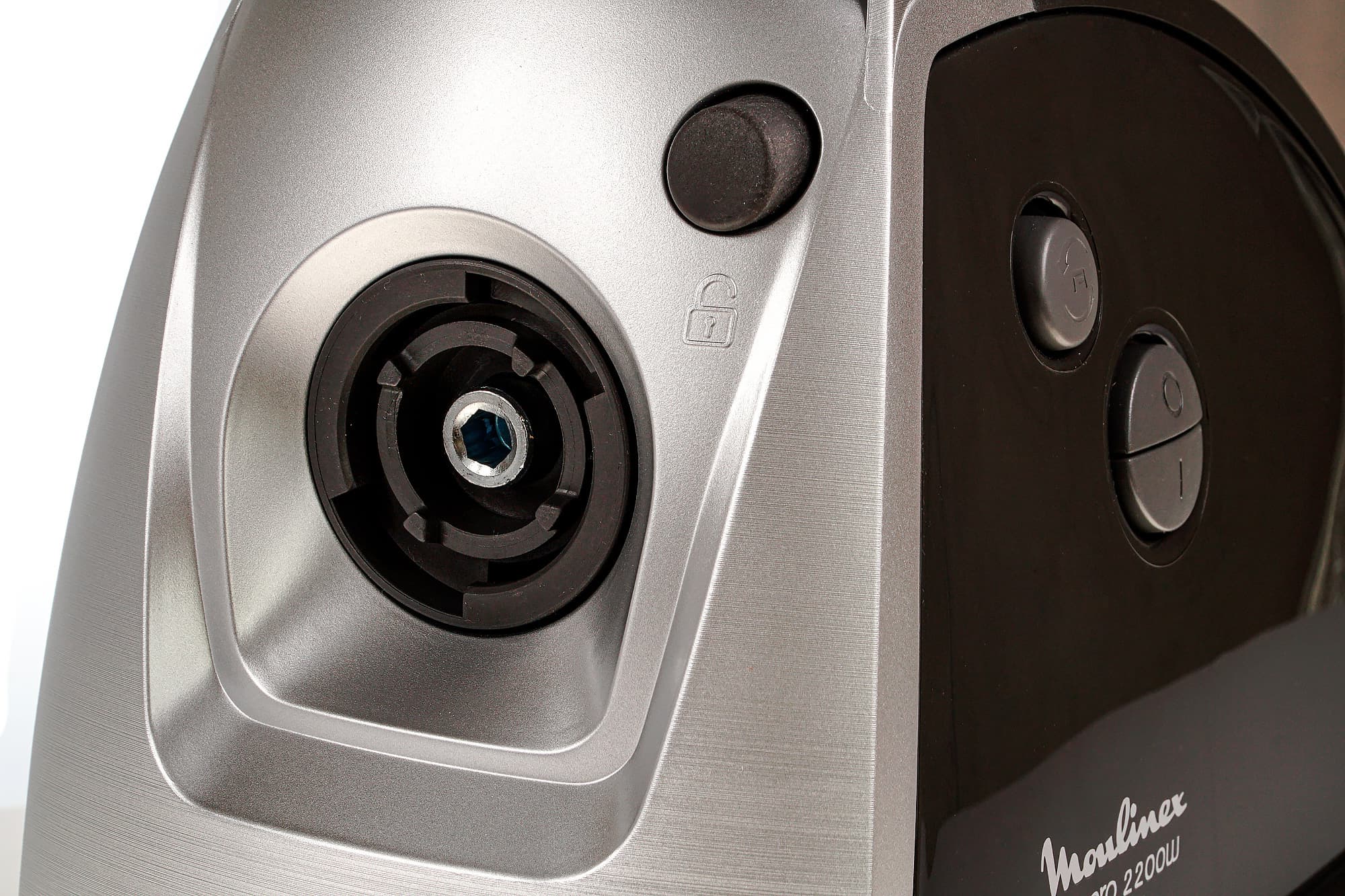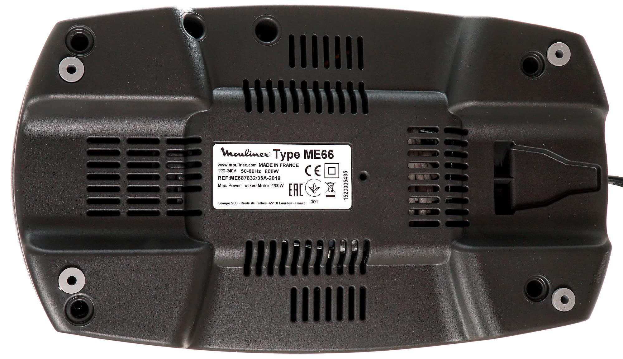 Управление Moulinex HV8 Pro ME687832, как и у большинства мясорубок, крайне простое. Все кнопки управления находятся в верхней левой части моторного блока. Окружность, разделенная на две части — это две кнопки. Нижняя запускает работу, верхняя — отключает. Левее и выше расположена кнопка реверса. Реверс может быть запущен только в том случае, если мясорубка выключена. Производитель называет это безопасной функцией реверса, которая предотвращает случайное включение обратного хода. Шнек вращается в обратную сторону только при удерживаемой кнопке.