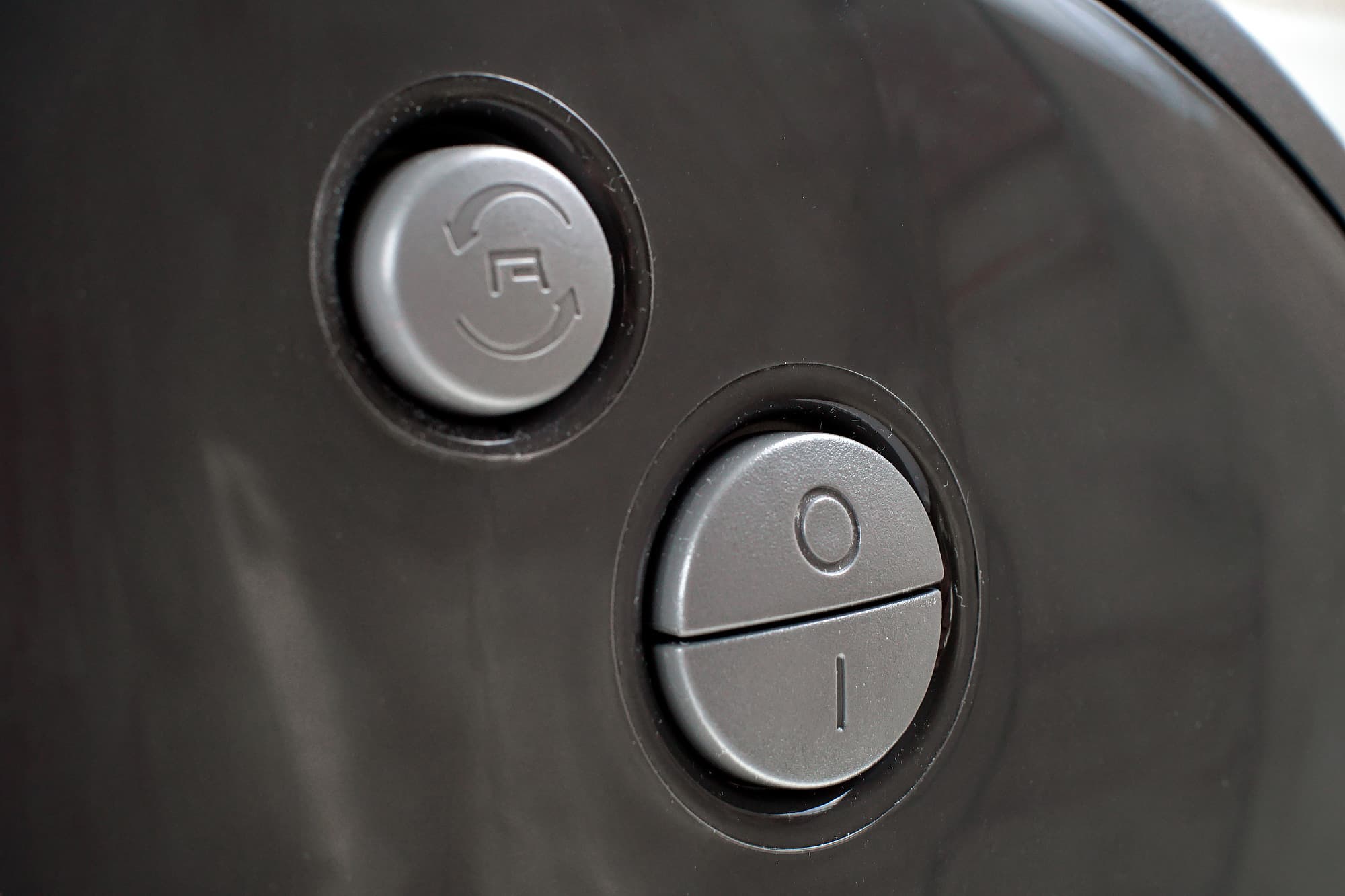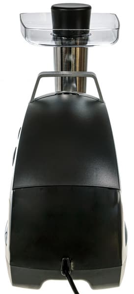 Моторный блок выглядит качественно собранным и изготовленным из недешевых материалов. Неплохо сочетается пластик темно-серого цвета боковых сторон и металлик торца. Благодаря устойчивой форме мясорубка в собранном виде надежно располагается на столе — не скользит и не сдвигается даже при надавливании со средней силой. Вверху слева расположен блок управления — кнопки, выделенные светло-серым цветом.