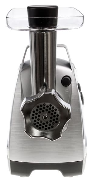 В комплект к прибору входят две стальные решетки: одна со средним с диаметром отверстий (4,5 мм), другая с крупными отверстиями (8 мм). Толщина формовочных дисков — 6 мм. Нож классической формы, лезвия весьма острые. Нож тоже массивный, таким образом имеет запас для заточки. Впрочем, производитель позиционирует лезвия как самозатачивающиеся.