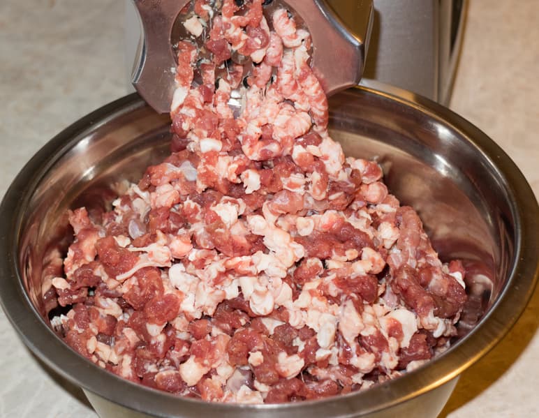 Мясо порублено, а не выдавлено. Оценить размер кусочков мяса можно по отдельным кускам жилок — они ярче выделяются в массе: