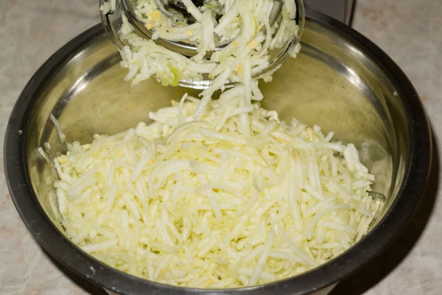 Вбили в натертые овощи одно яйцо, посолили-поперчили, выдавили пару зубчиков чеснока и всыпали пару ложек муки. Хорошо перемешали тесто для картофельно-кабачковых оладий.