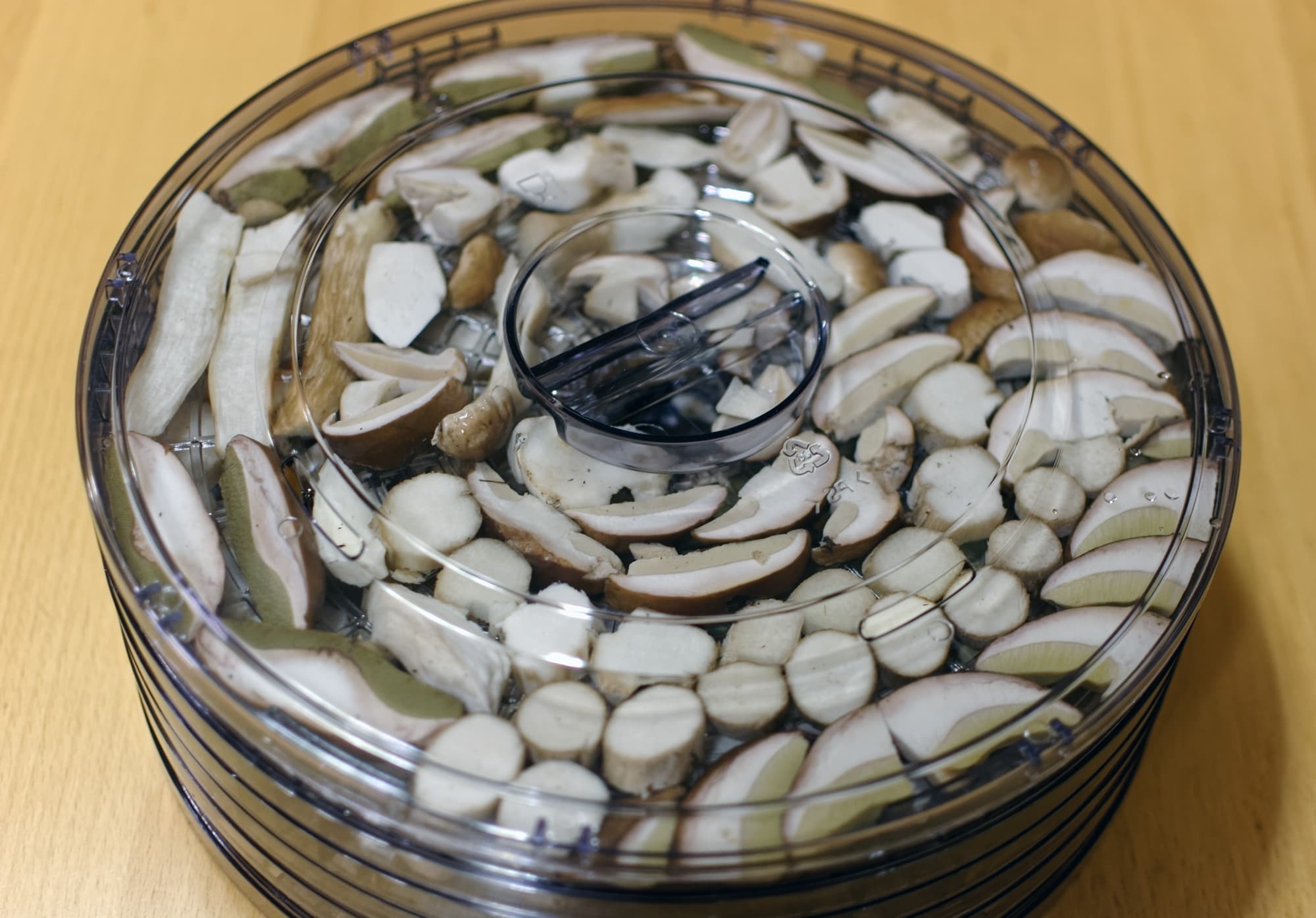 Щели в сетчатом дне поддона имеют изменяющуюся от внутренней к внешней окружности длину и постоянную ширину около 6 мм. Это не такая уж мелкая ячейка, что в определенных случаях может стать проблемой — например, при сушке маленьких грибов.