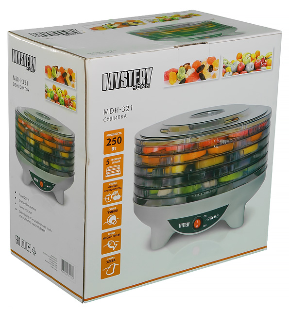Упаковка яркая и разноцветная (существенно более разноцветная, чем сам продукт). Основные характеристики (количество лотков, потребляемая мощность и пр.) можно прочитать прямо здесь.