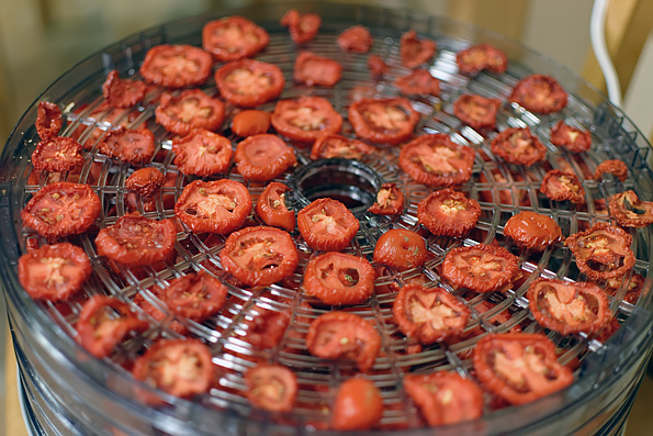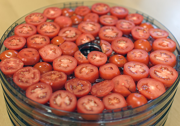 Через 2 часа мы поменяли поддоны местами, а заодно посмотрели, как себя чувствуют подопытные. Помидоры, нарезанные вдоль, были довольно влажными, лишь слегка подсохли.