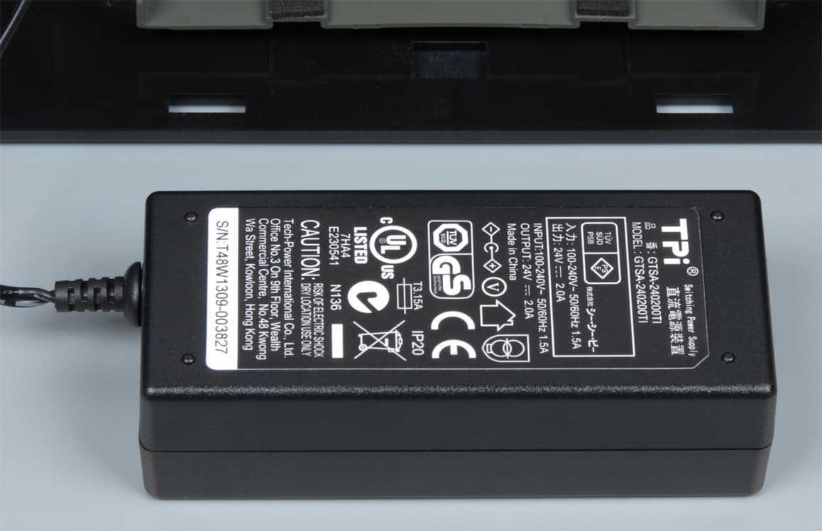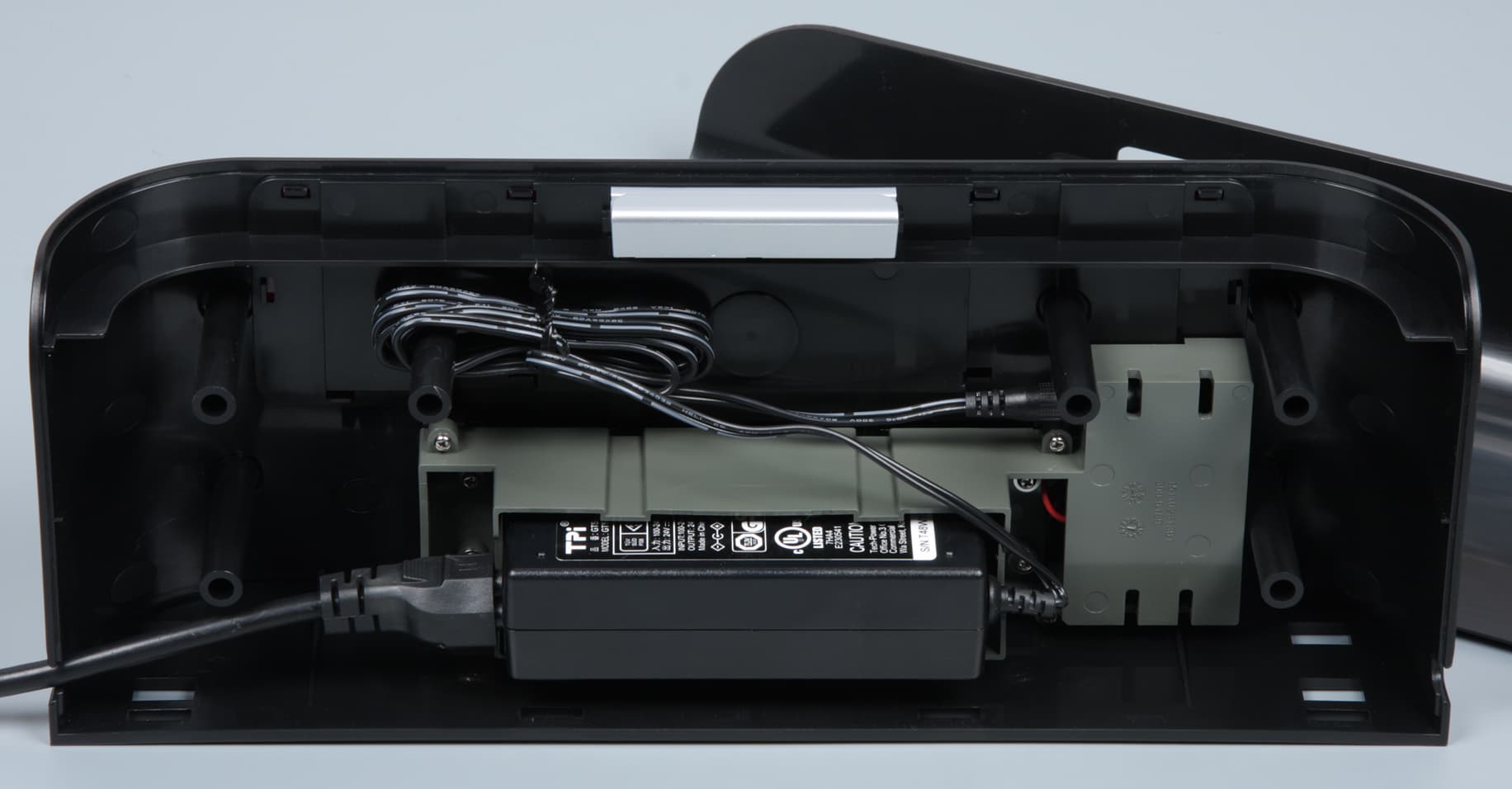 Сняв заднюю крышку базы, можно увидеть, что внешний блок питания устанавливается в специальную нишу (единственным верным способом), при этом сетевой кабель питания пропускается через вырезы на правом или на левом боку.