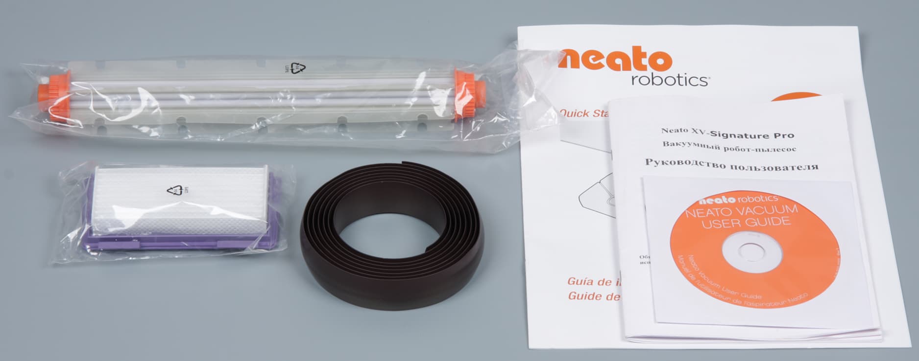 Из дополнительных аксессуаров и расходных материалов в комплект поставки вошли запасной фильтр (тоже типа High-Performance с увеличенной относительно фильтра Standard поверхностью) для пылесборника, альтернативная лопастная (без ворса) щетка и магнитная лента-ограничитель длиной 2 м, а также документация — краткое руководство (без русского вариант текста, но картинки более-менее понятны и без него), CD-ROM с полным руководством пользователя (файл PDF, тоже без русского) и исходными текстами части ПО и брошюра руководства пользователя теперь уже на русском языке.