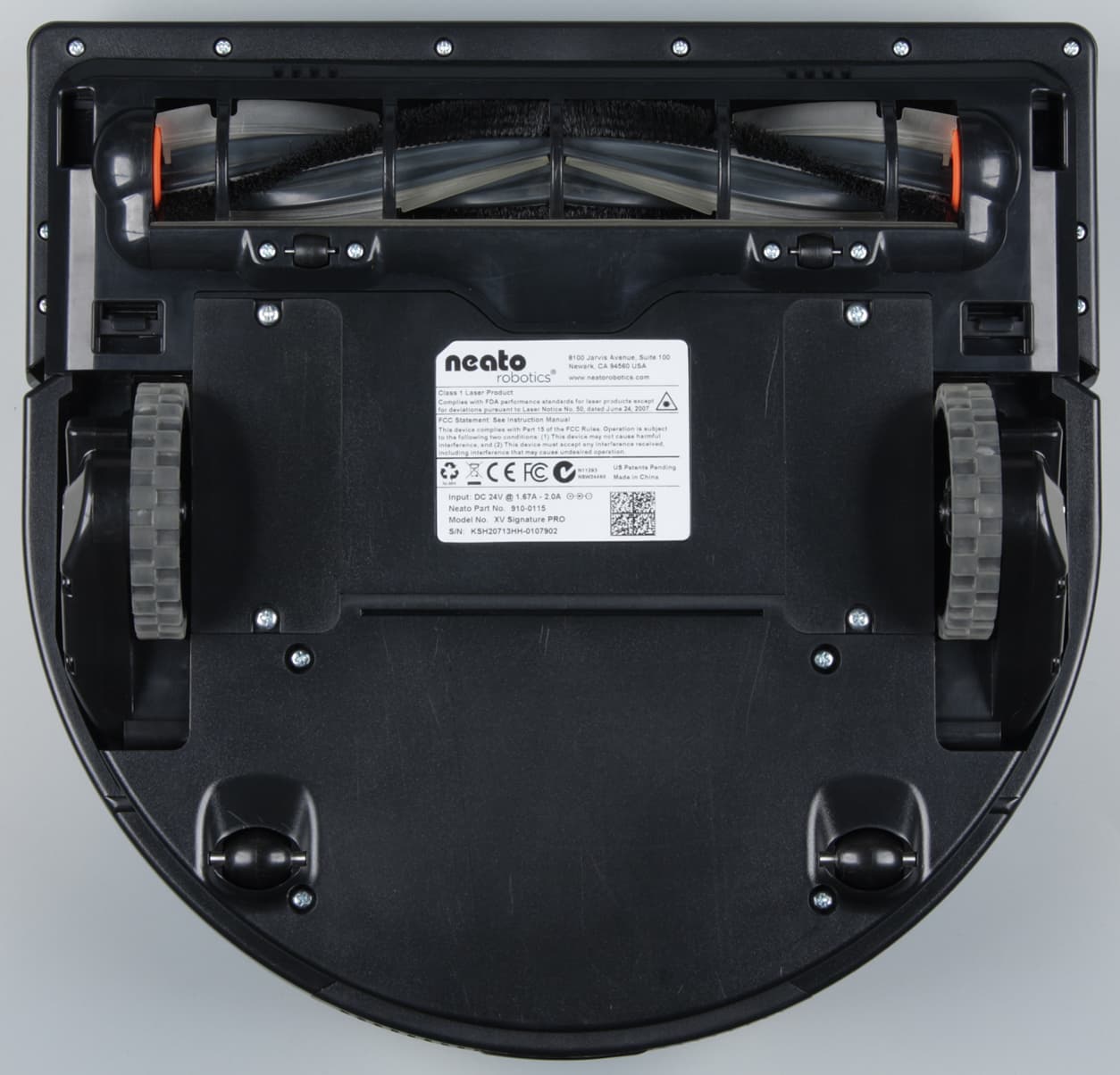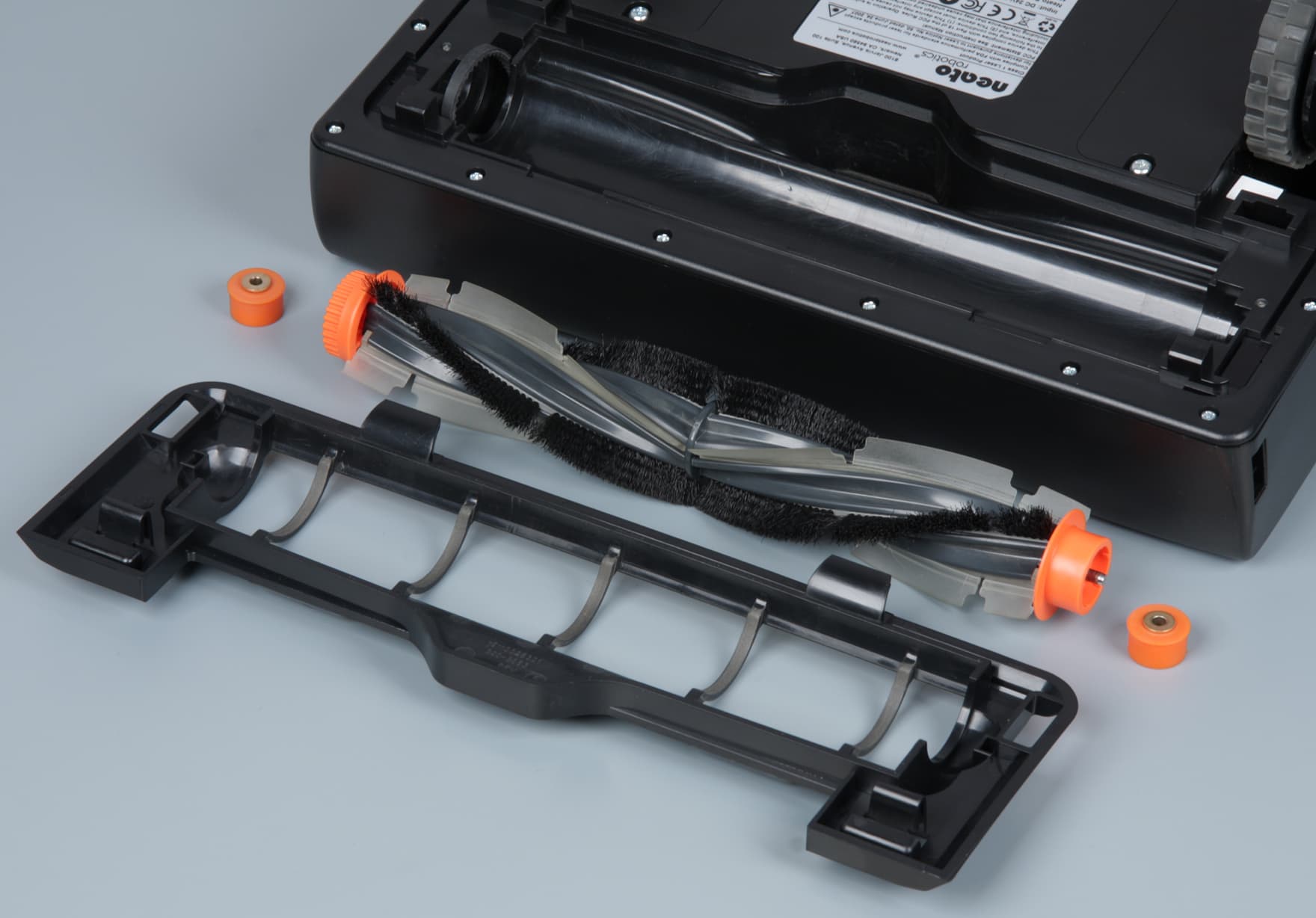 Один — коаксиальный — разъем используется для зарядки пылесоса непосредственно от блока питания, второй — Mini-USB — задействуется при обновлении встроенного ПО. Перевернув пылесос вверх днищем, мы увидим два ИК-датчика перепада высоты (окошки в углах спереди), отсек с щеткой, две крышки отсеков аккумуляторов, два ведущих колеса на подпружиненных рычагах, и четыре поддерживающих ролика — два поменьше в передней части и два побольше в задней части.