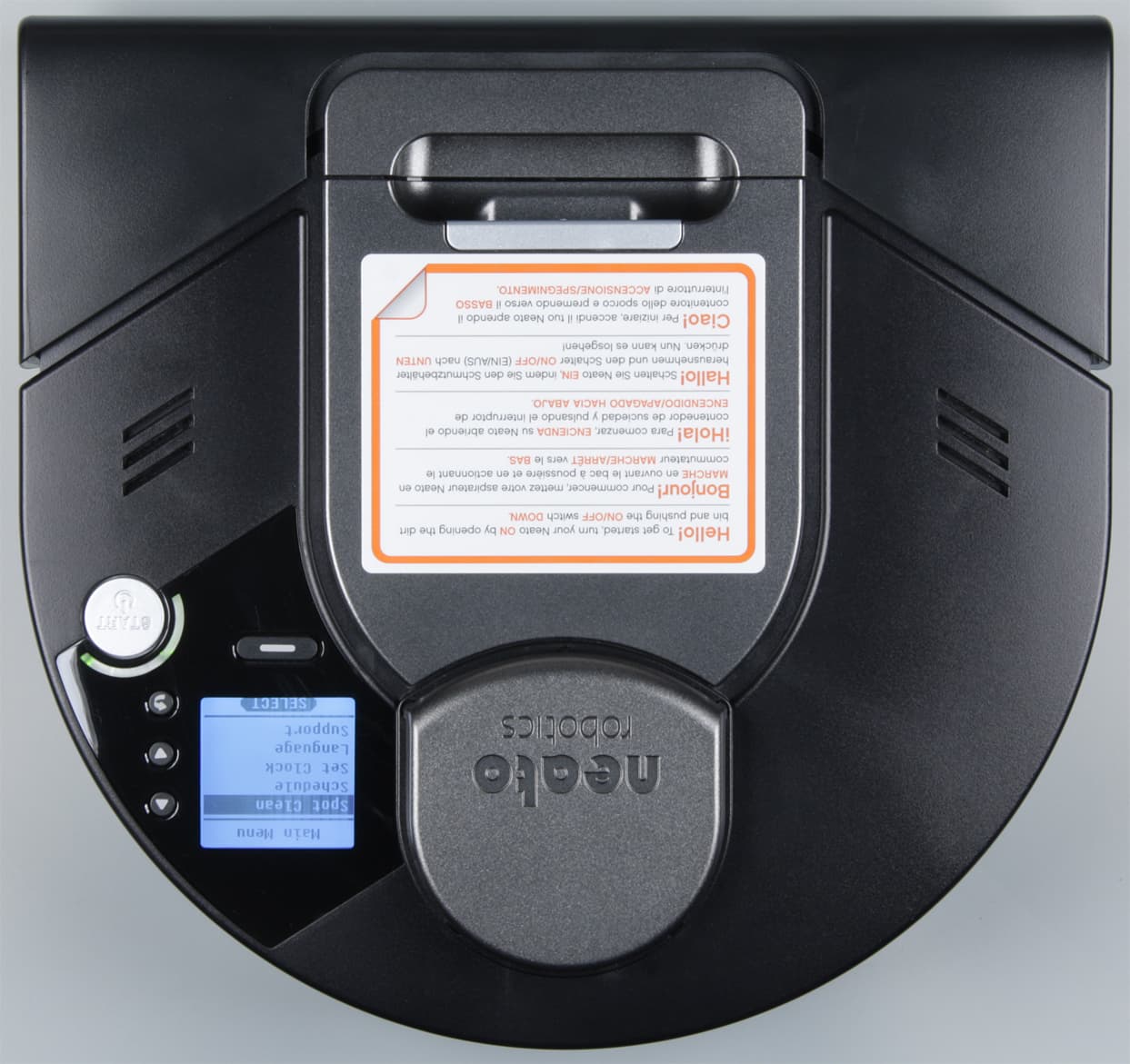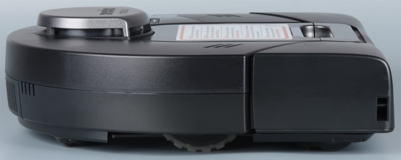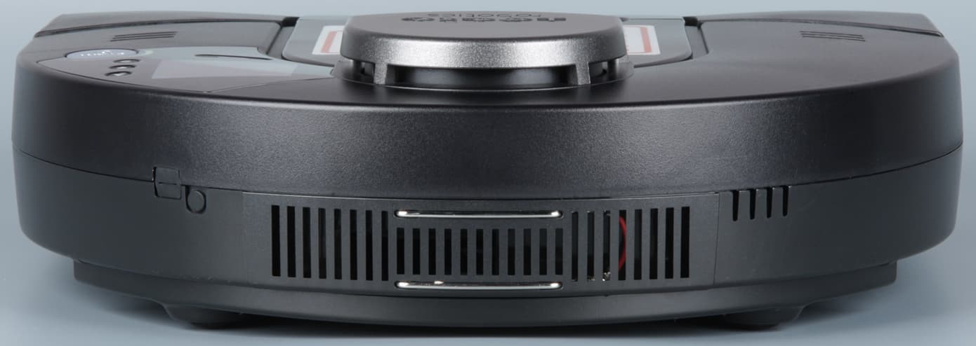 Небольшой скос спереди снизу помогает роботу преодолевать препятствия. Материал корпуса — это в основном черный (с небольшой вариацией оттенка) пластик с матовой поверхностью и, видимо, без покрытия, что в итоге уменьшает заметность повреждений. Исключение — верхняя передняя часть отсека пылесборника, крышка пылесборника и башенка лидара — они сверху имеют темно-серебристое покрытие. Сверху слева от указанной башенки располагается контрольная панель с механическими кнопками: три мелкие для навигации по меню, одна побольше функциональная и большая серебристая запуска; с относительно большим графическим монохромным ЖК-дисплеем и светодиодным — оранжевым/зеленым — индикатором состояния, огибающим кнопку запуска. Прикрыта контрольная панель вставкой из прозрачного пластика, которая легко царапается и на которой заметны как царапины, так и следы от пальцев. В передней части корпуса с заходом на боковые поверхности установлен механический бампер.