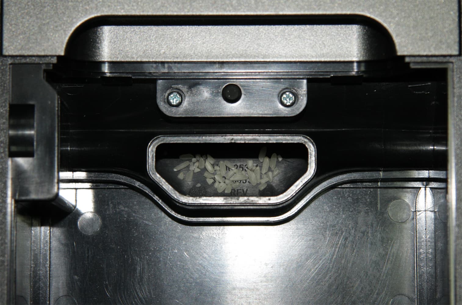В целом, несмотря на широкую щетку, громкий звук и сильный поток воздуха (он иногда задувал в микрофон камеры, находящейся в метрах четырех от пылесоса), убирает робот быстро, но не так качественно, как ожидалось. Причин этому, как нам видится, несколько. По факту воздушный поток, который прокачивает через себя робот распределяется на всю длину (а это 238 мм) щетки, что уменьшает действующую силу всасывания, а ведь только с ее помощью рис (как и любой другой мусор) может перемещаться в пылесборник сама щетка мусор в емкость не закидывает, а только подцепляет с пола. Что уж совсем странно, так это то, что часть риса остается даже на дне патрубка к пылесборнику, где скорость воздушного потока максимальная.