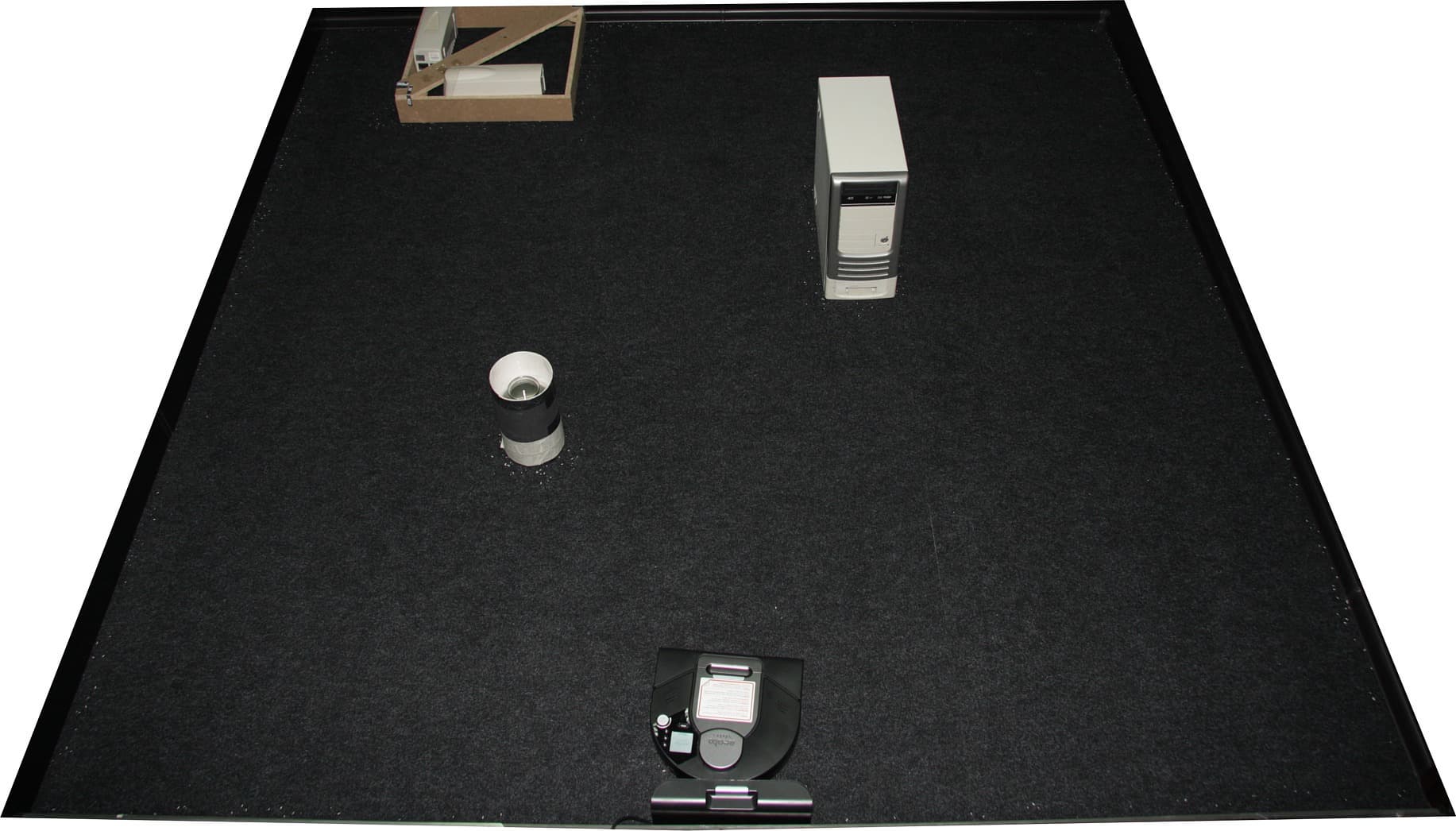 В начале уборки робот обходит по периметру доступную для уборки площадь, а затем, двигаясь змейкой, обходит внутреннюю часть территории. Робот определенно строит и использует карту, это видно по маршруту движения — он заполняет змейкой всю доступную площадь, при этом по возможности убирает поверхность только один раз и целенаправленно переходит к тому месту, которое он еще не убирал. Без карты такое поведение было бы невозможно осуществить. Видимо иногда, как на приведенном ролике, на первом этапе обхода робот делит территорию на относительно большие участки, которые убирает последовательно. Видно, что по возможности робот движется правым боком к препятствию, дополнительно контролируя расстояние до него с помощью ИК-датчика на бампере. Этот датчик, а также механический бампер помогают роботу корректно работать при наличии низких препятствий (как балка в нижней части кадра или плинтуса вдоль стен), которые не обнаруживаются лидаром. Несмотря на такое обилие датчиков робот не всегда корректно отслеживает свои габариты относительно непреодолимых препятствий. Так на ролике выше видно, что базы робот все-таки касается, а повороты в углах даются ему с большим трудом, и тут уж кто кого пересилит, или робот раздвинет то, что ему мешается (тяжелую балку или раму из ДСП, формирующую загон), или задерет заднюю часть, но все-таки повернет. Кстати, в узкие места, которые шире корпуса робота на 50 мм и которые он может определить с помощью лидара, пылесос даже и не пытается заезжать. В итоге нам пришлось немного отступить от правил тестирования и увеличить ширину загона до 40 см, а сначала мы выставили 38 см = 33 см (ширина робота) + 5 см (зазор по методике).