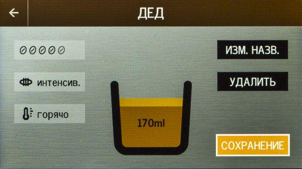 Нажатие «Мой кофе» открывает страницу с девятью иконками индивидуальных рецептов. Для начала долгим нажатием (именно долгим, иначе начнется приготовление чего-то, прописанного по умолчанию) выбираем любую, получаем подобную основной страницу с шестью кофейными напитками, молоком и горячей водой. Коротким нажатием выбираем тот, настройки которого желаем поменять; их набор нам уже знаком, только нельзя заказать приготовление двух чашек. Задаем понятное название до 15 символов (кириллица плюс цифры и пробел) и сохраняем, чтобы потом коротким нажатием готовить напиток по своему вкусу.