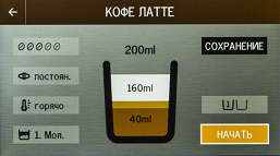 Некоторые параметры можно менять и во время приготовления, после начала которого отображается экран с соответствующими настройками, главное здесь — не упустить момент: изменить, например, количество молока после того, как оно уже налилось, не получится. Уже начавшееся приготовление можно отменить или прекратить в любой момент (например, если видим, что чашка маловата для выбранного объема).