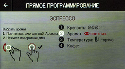 Первый из них называется «Прямое программирование», смысл его понятен: задание параметров всех возможных напитков. Но целесообразность наличия в меню такого раздела может вызвать сомнение, ведь то же самое можно сделать с основной страницы: длительным нажатием войти в режим установок для какого-то напитка, внести изменения и нажать «Сохранить». Оказывается, разница не только в оформлении: последним действием при прямом программировании будет приготовление порции с предложением нажимать кнопку «поворотного диска» по достижении желаемого объема для каждого компонента напитка. Можно сказать, что при этом мы подстраиваемся под чашку или бокал, а не задаем объемы в миллилитрах.