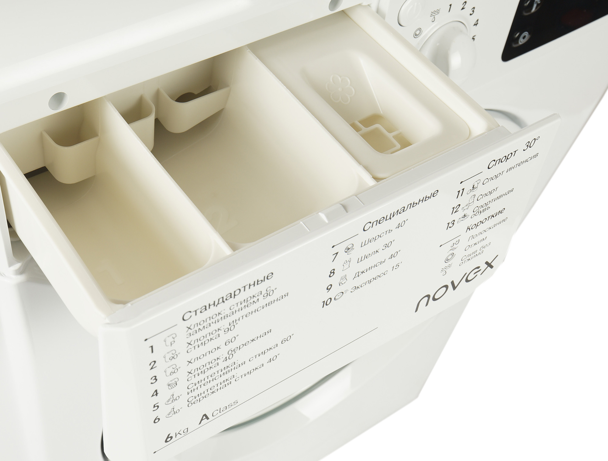 Выбор программ стирки у Novex WM 6N10CM1W производится традиционно — с помощью круглого селектора. Программы пронумерованы, а на крышке лотка для моющих средств есть шпаргалка, расшифровывающая порядок и назначение сценариев.