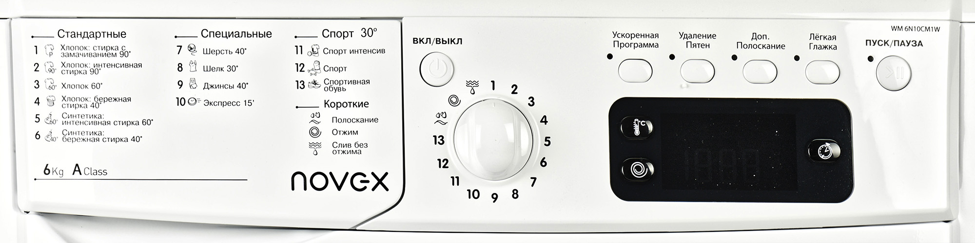 У Novex WM 6N10CM1W целых четыре режима стирки хлопка, две программы предназначены для синтетики, по одной — для шерсти и деликатных тканей. Присутствует также быстрая пятнадцатиминутная стирка для несильно загрязненного белья — практически обязательная опция для современных стиралок.
