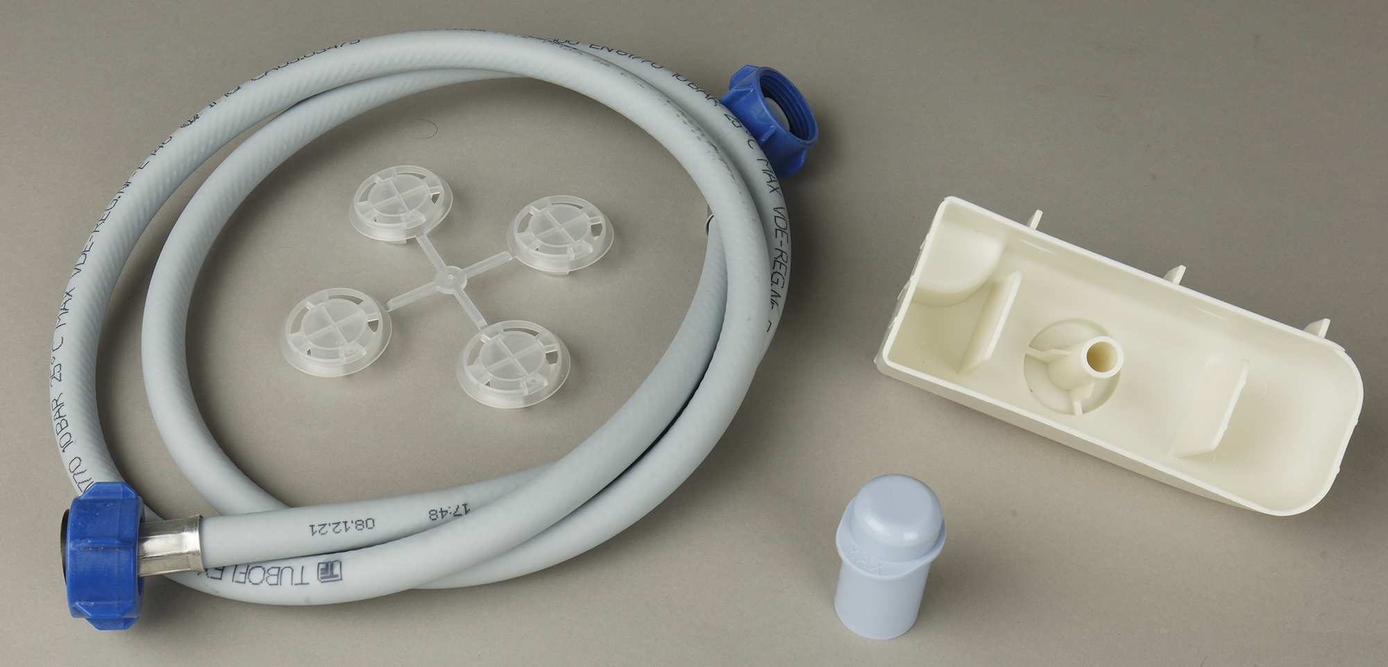 К коммуникациям стиральная машина подключается тривиально: заливной шланг — к водорозетке, сливной — в канализацию. Конструкция обоих шлангов самая простая, без инженерных излишеств вроде клапанов аквастопа.