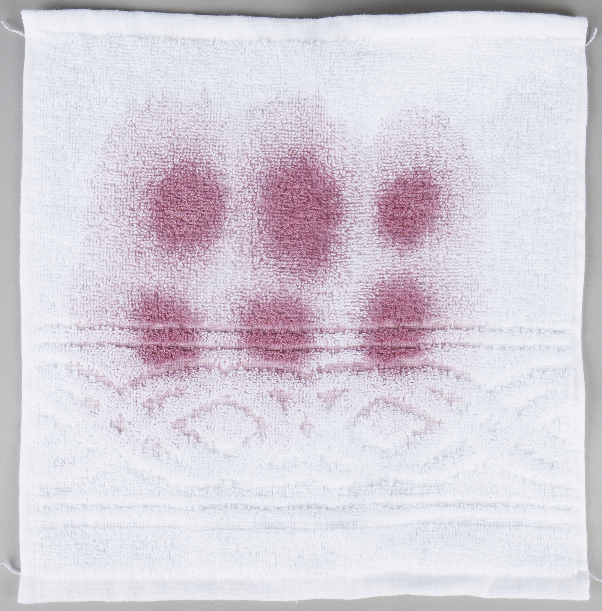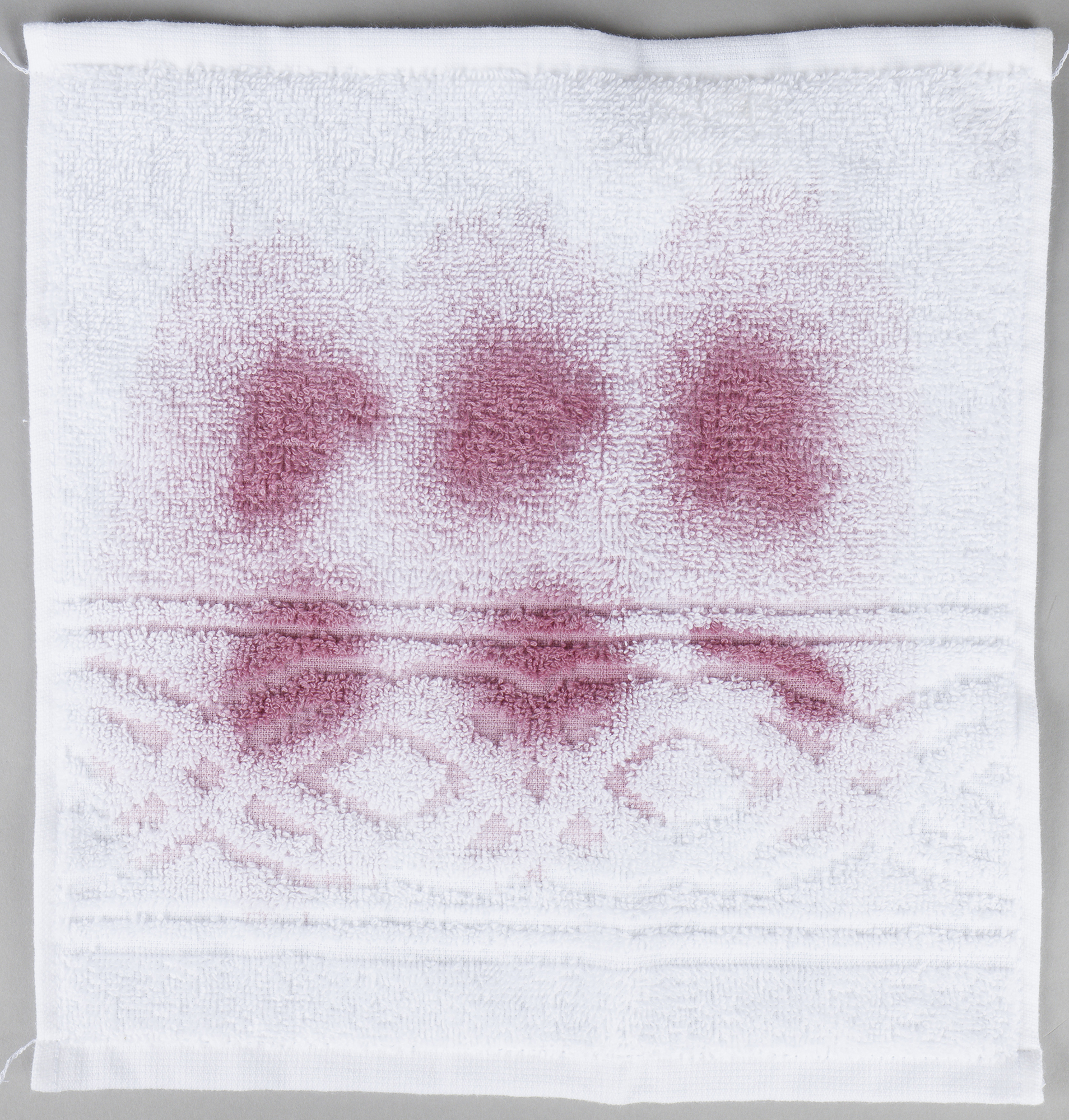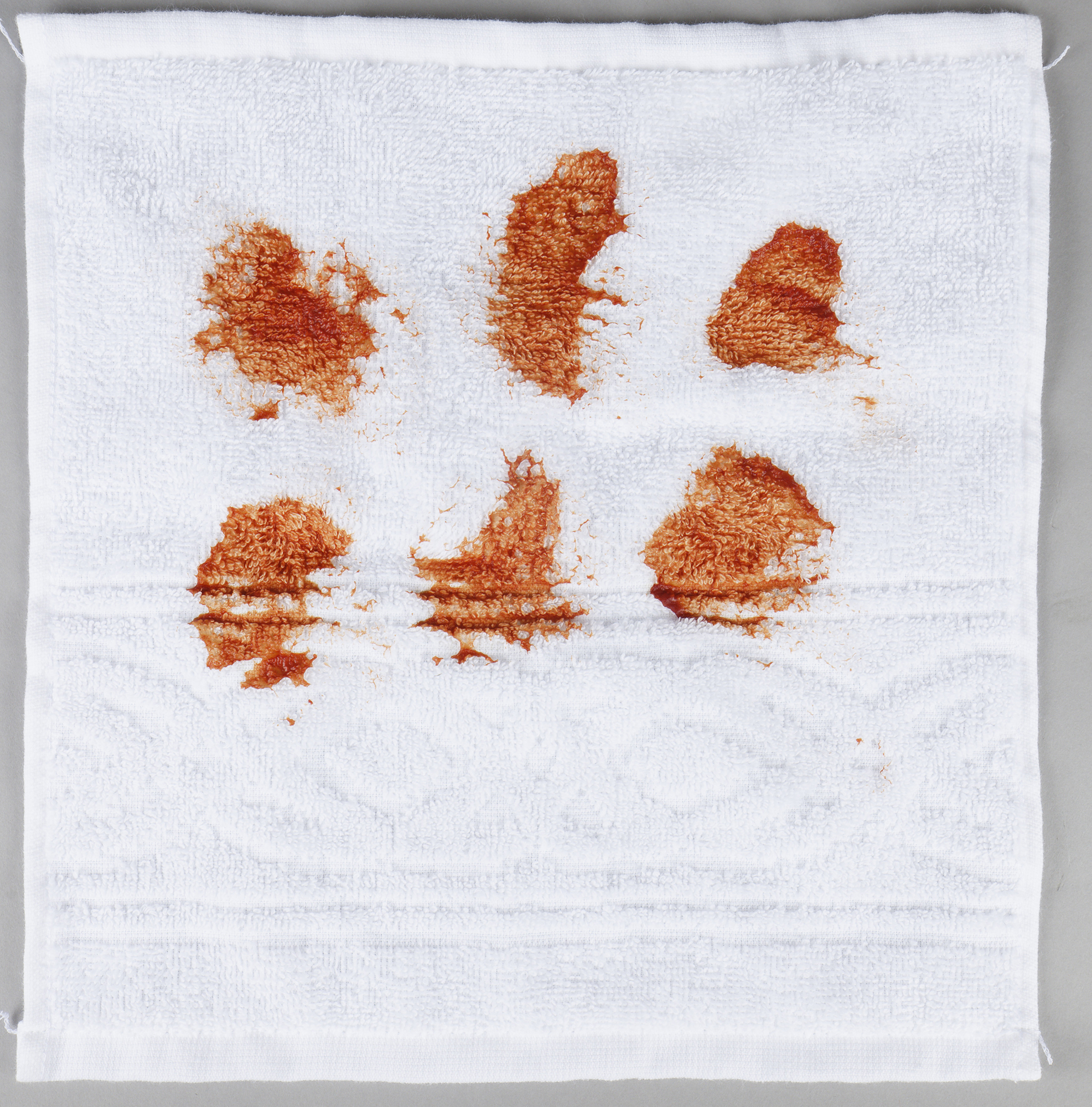 На комплект из пяти полотенец мы нанесли красное вино, соевый соус, кетчуп, растительное масло, кровь и какао (на каждом полотенце свое вещество). Эти авангардные картины в стиле абстрактного экспрессионизма высушили при комнатной температуре в течение суток, после чего загрузили тестовую стирку.