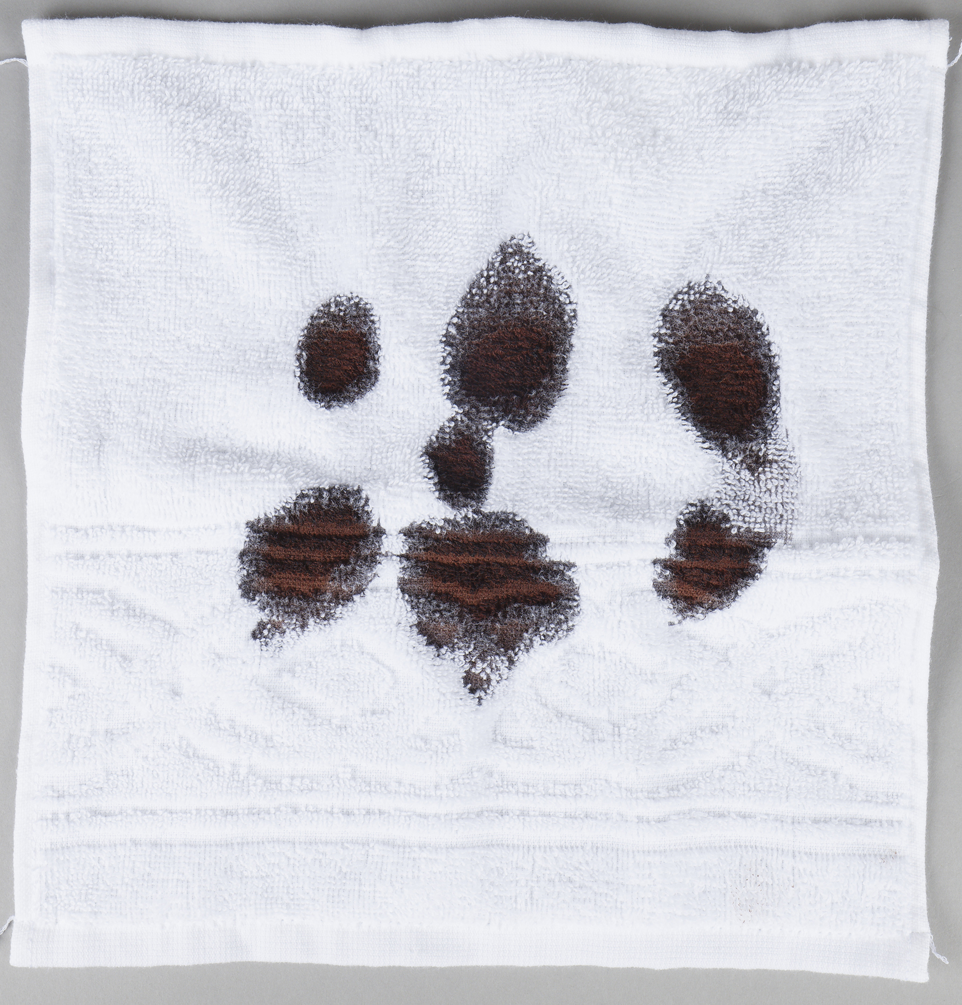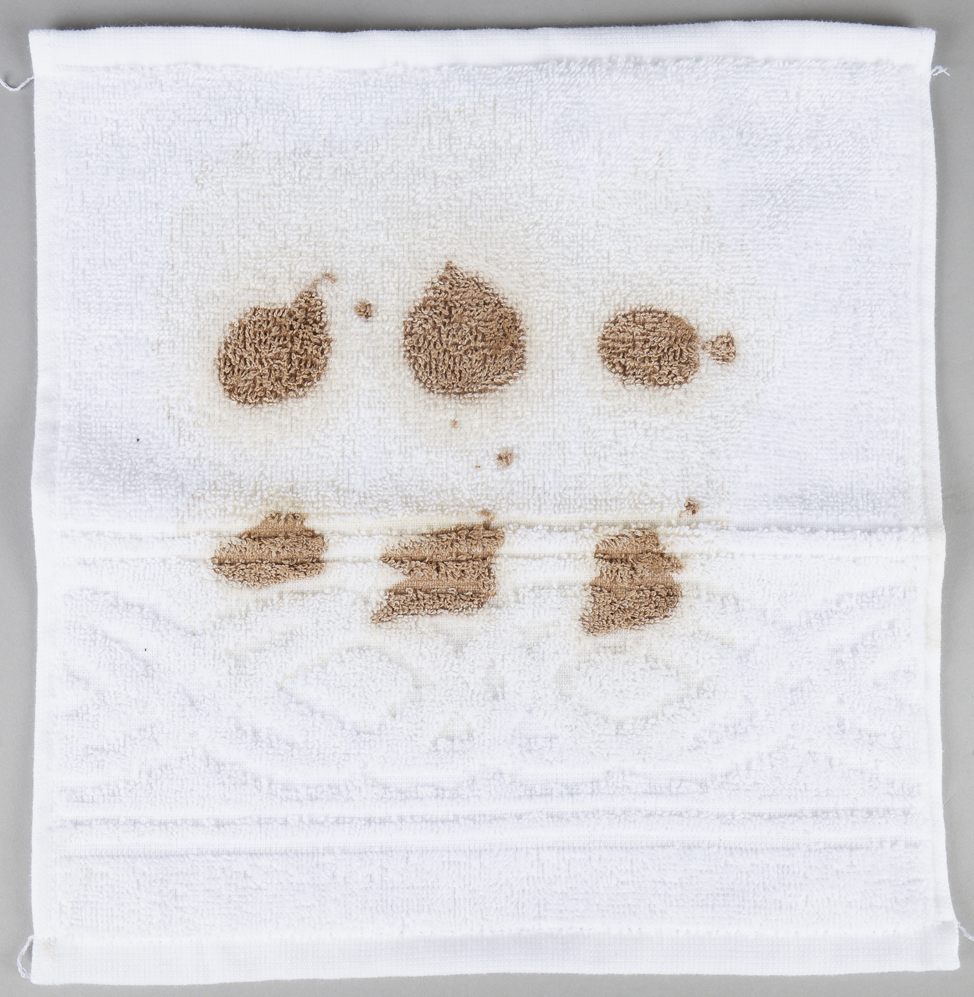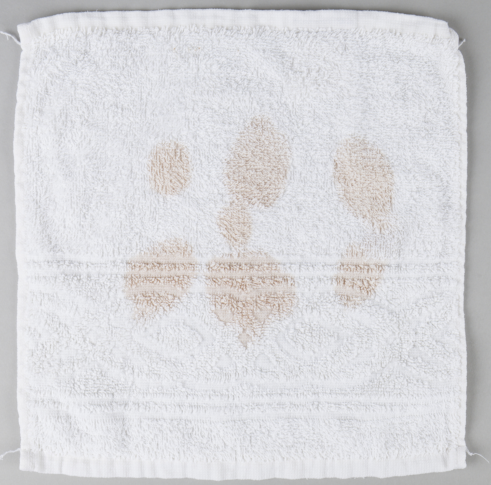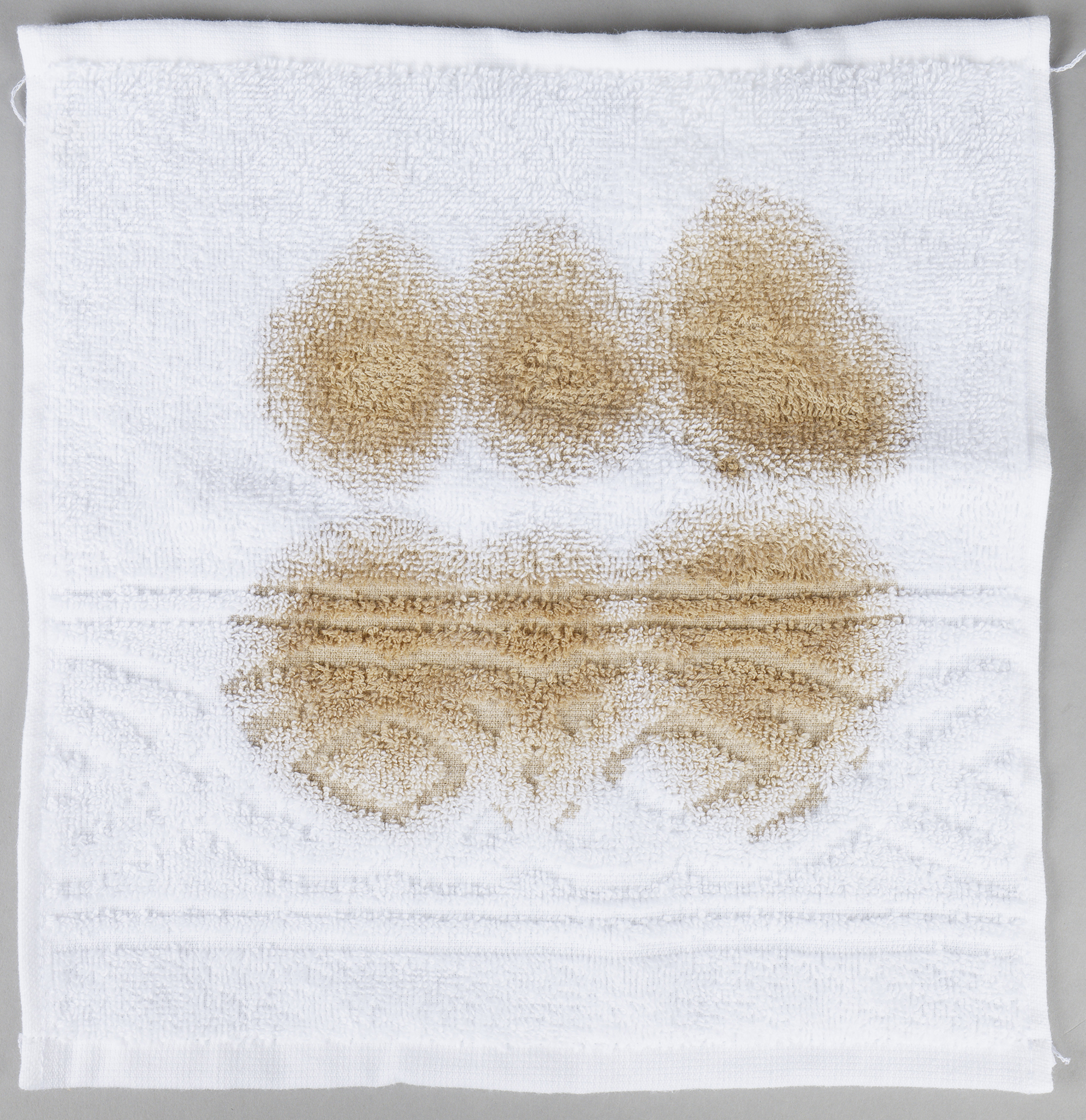На комплект из пяти полотенец мы нанесли красное вино, соевый соус, кетчуп, растительное масло, кровь и какао (на каждом полотенце свое вещество). Эти авангардные картины в стиле абстрактного экспрессионизма высушили при комнатной температуре в течение суток, после чего загрузили тестовую стирку.