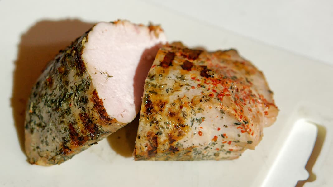 Кусок грудки индейки весом в 750 граммов посыпали солью, острым турецким перцем и абхазской зеленой аджикой, поместили в вакуумный пакет и приготовили в су-виде на температуре 63 градуса в течение 8 часов.