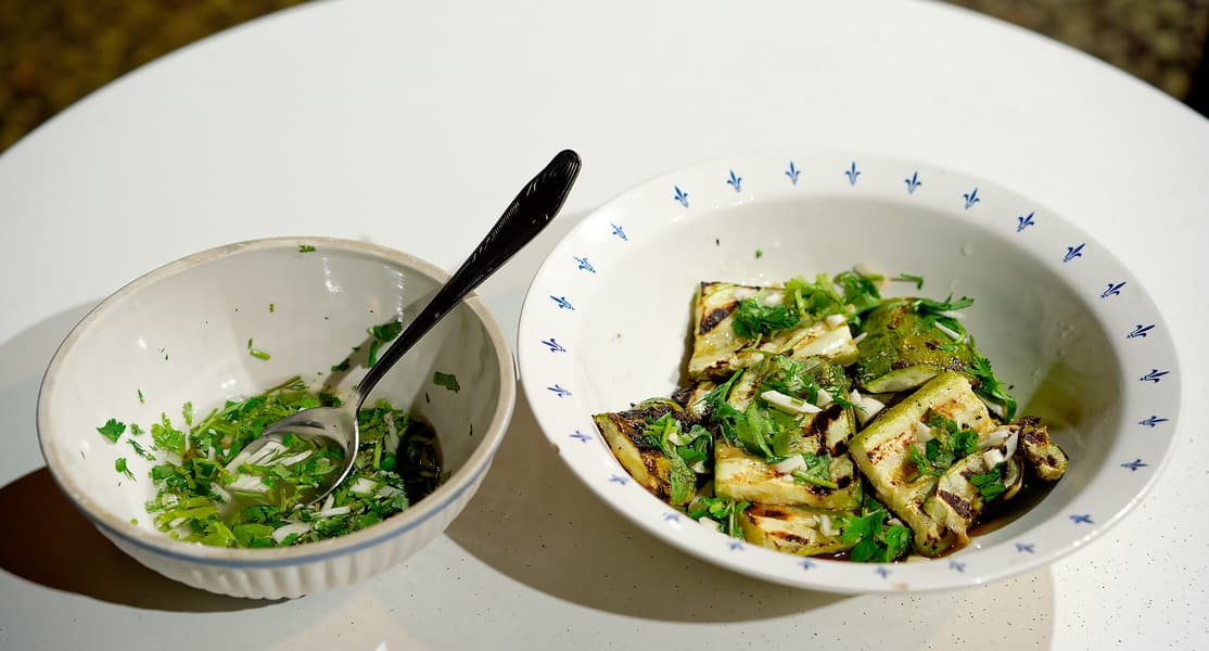 Пока дожаривалась кукуруза, уже готовые кабачки снимали по несколько кусочков, поливая соусом из воды, резаного чеснока и кинзы.