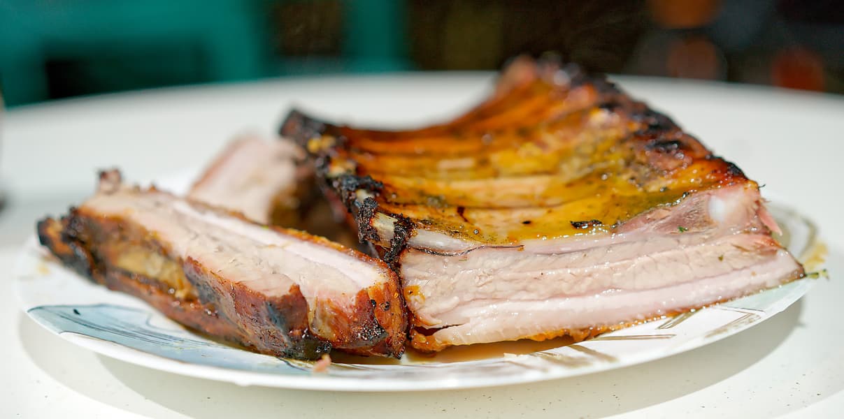 Это фрагмент того же копорского поросенка: на этот раз небольшие ребрышки. Не забываем, что наш O-Grill 900MT — не угольная барбекюшница и не большое красное яйцо, где мясо можно и нужно томить полдня в режиме духовки. А что же нам делать с ребрами на гриле? Несомненно, можно их просто обжарить, переворачивая в процессе, и съесть.