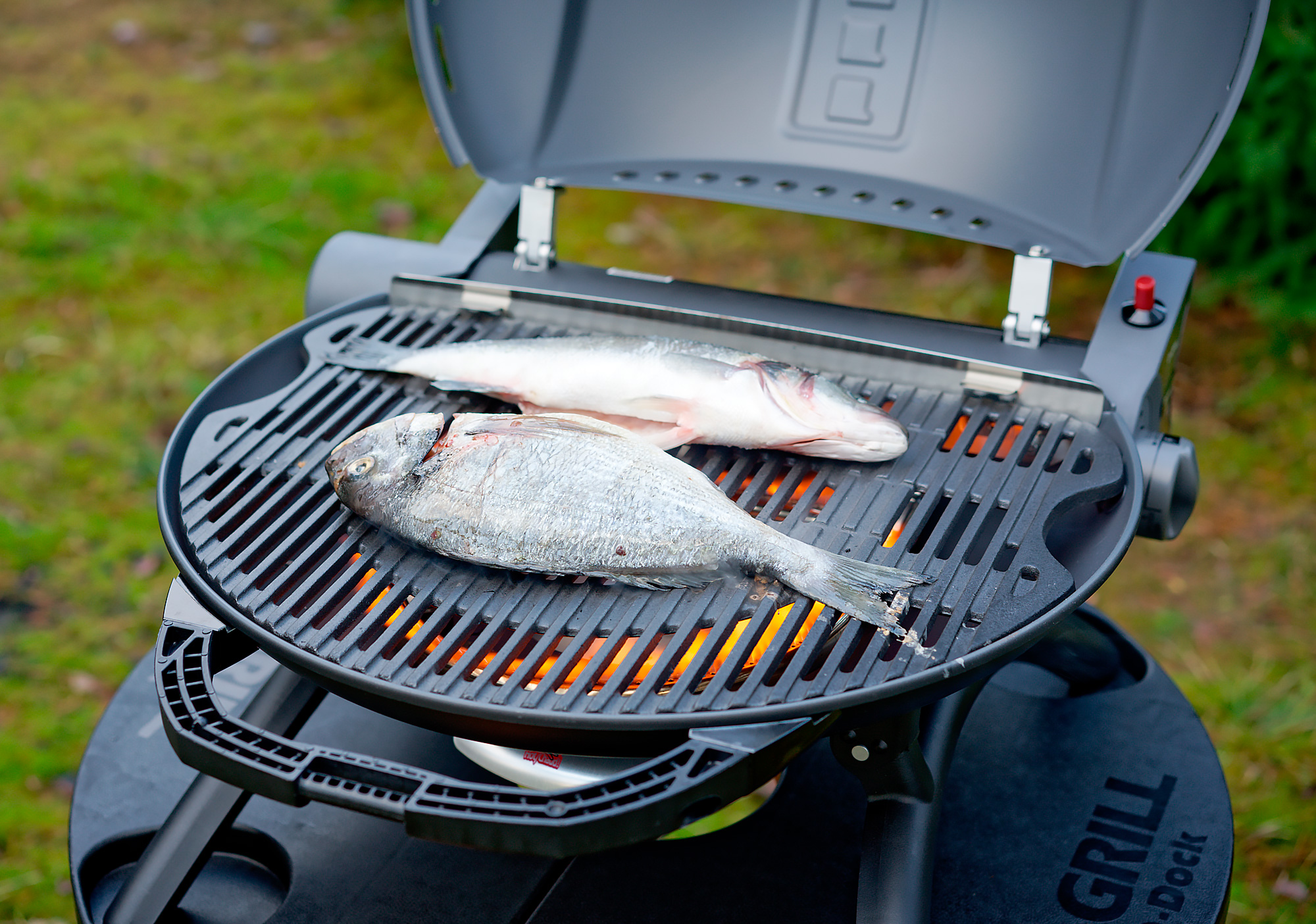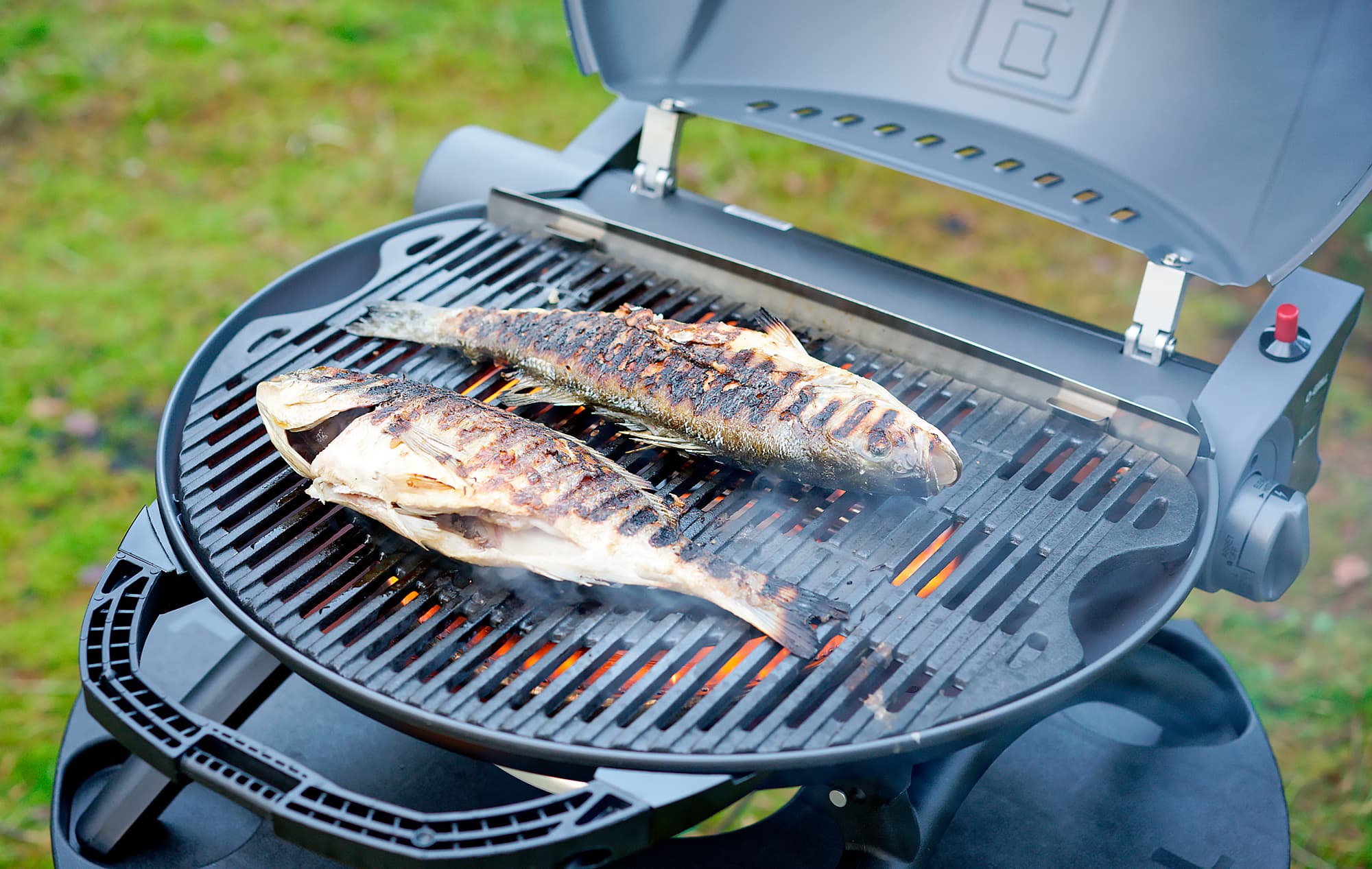 Поскольку мы якобы на рыбалке, баллон использовали портативный. Нагрели гриль с закрытой крышкой до показания термометра в 250 градусов и положили рыбин. Обе красавицы были предварительно выпотрошены и посолены, а затем сбрызнуты маслом, чтобы меньше прилипали к решетке.