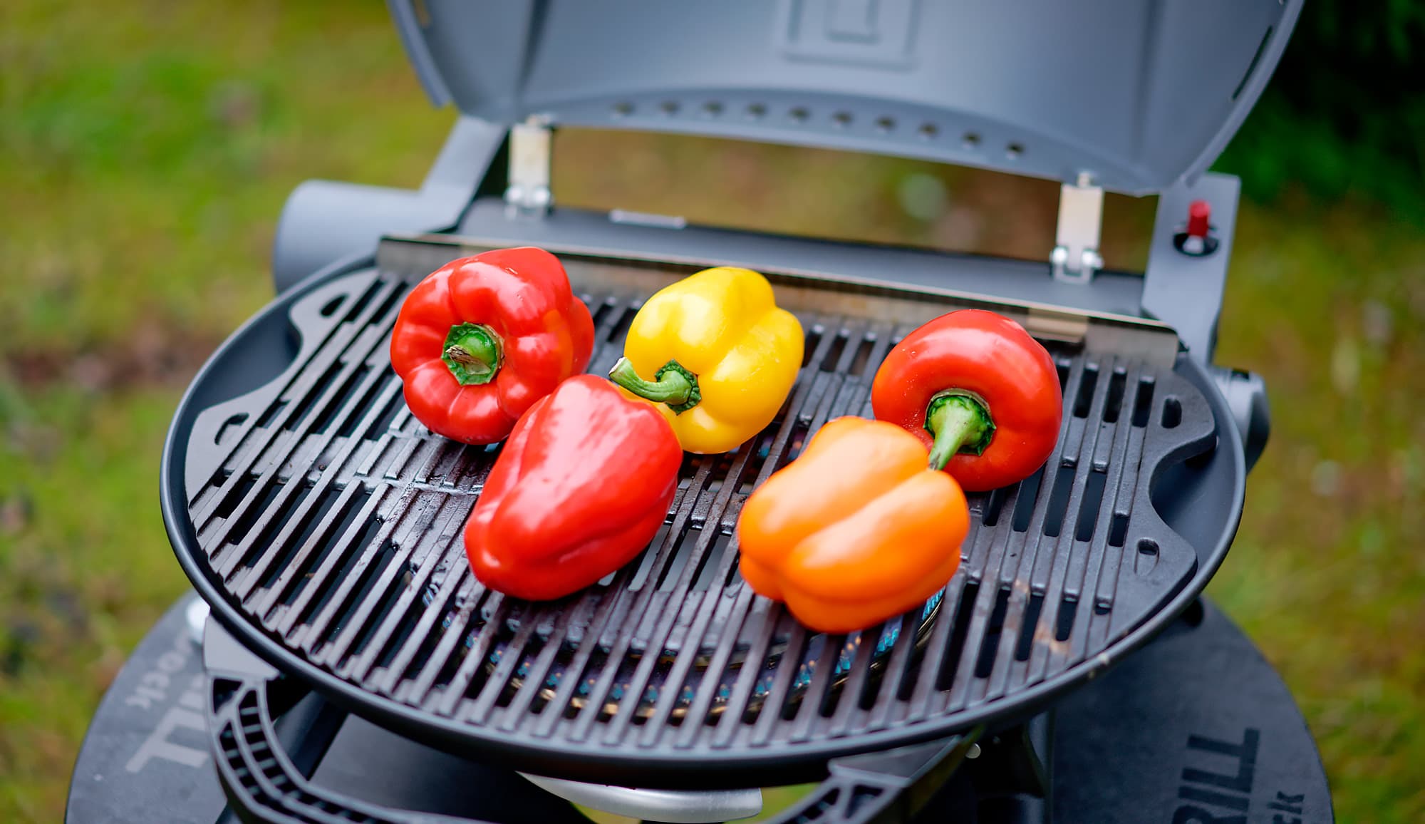 Пеклись перцы довольно быстро. Гриль — это не духовка, непрямого нагрева тут нет, поэтому мы их несколько раз переворачивали, но потом крышку сразу закрывали: это гарантия того, что те места, которые непосредственно не прикасаются к решетке гриля, тоже пропекутся.