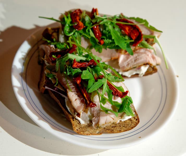 Индейку пустили на идеальные сэндвичи: свежий зерновой хлеб, каймак, немного красной аджики, индейка, вяленые томаты, руккола. Высокая кухня на пленэре!