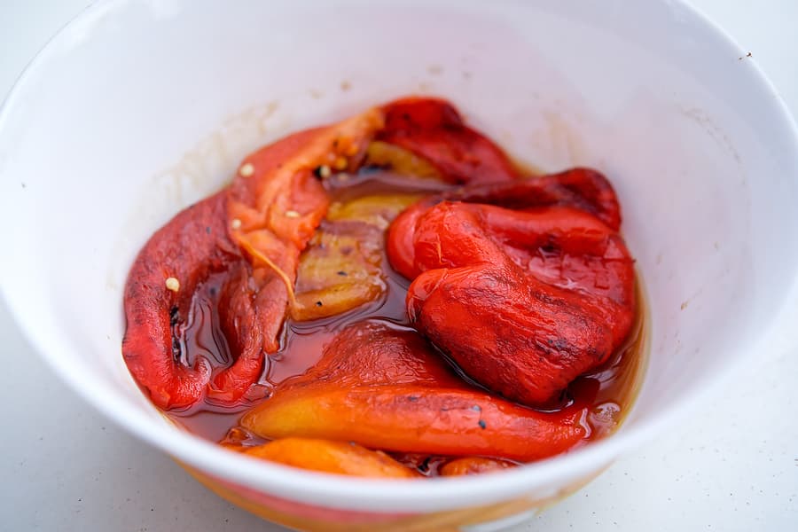 Обугленные перцы покидали в миску и накрыли тарелкой так, чтобы получилось более или менее герметично. Пар горячих перцев обеспечил легкую очистку кожицы; мякоть перцев мы руками разорвали на куски, удалив хвостики и сердцевину. Жидкость на фото ниже — это их собственный, перечный сок, поэтому чистить лучше сразу над миской.