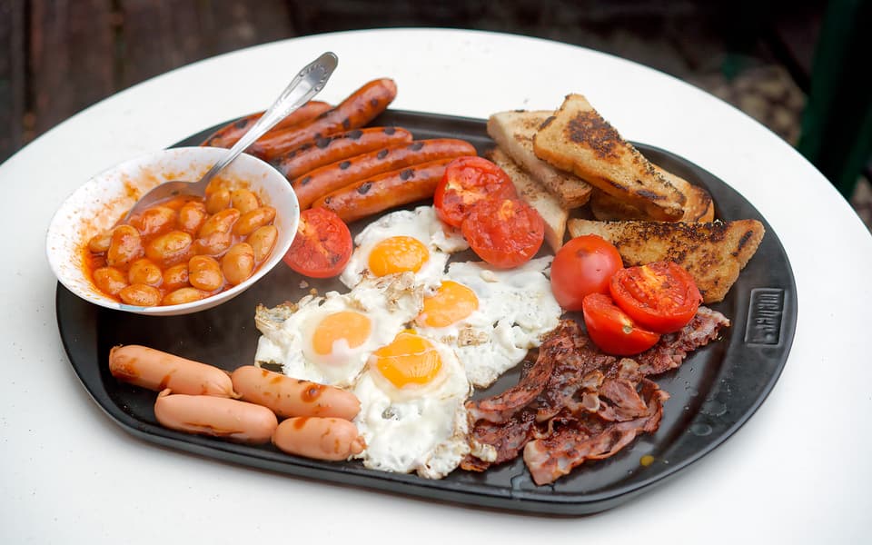 Английским завтраком, в отличие от скудного континентального, называют богатый набор продуктов, который состоит из гренок, колбасок, сосисок, бобов в томате, глазуньи, помидоров, бекона и шампиньонов гриль, а если дело происходит ближе к Шотландии, то, возможно, кровяной колбасы. Мы просто выбрали те продукты, которые были доступны в ближайших магазинах, разделили их на партии и приготовили на стальной решетке.