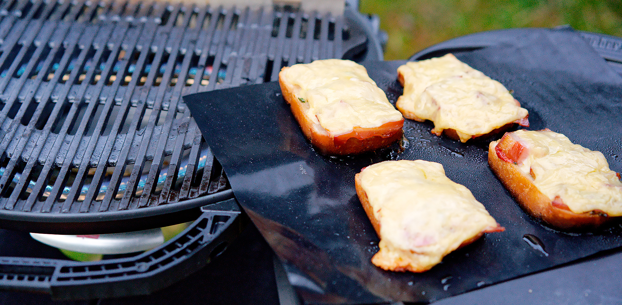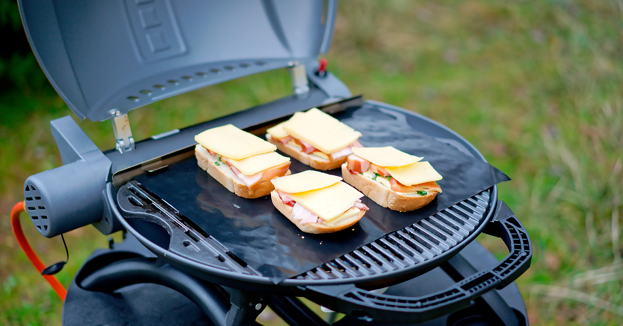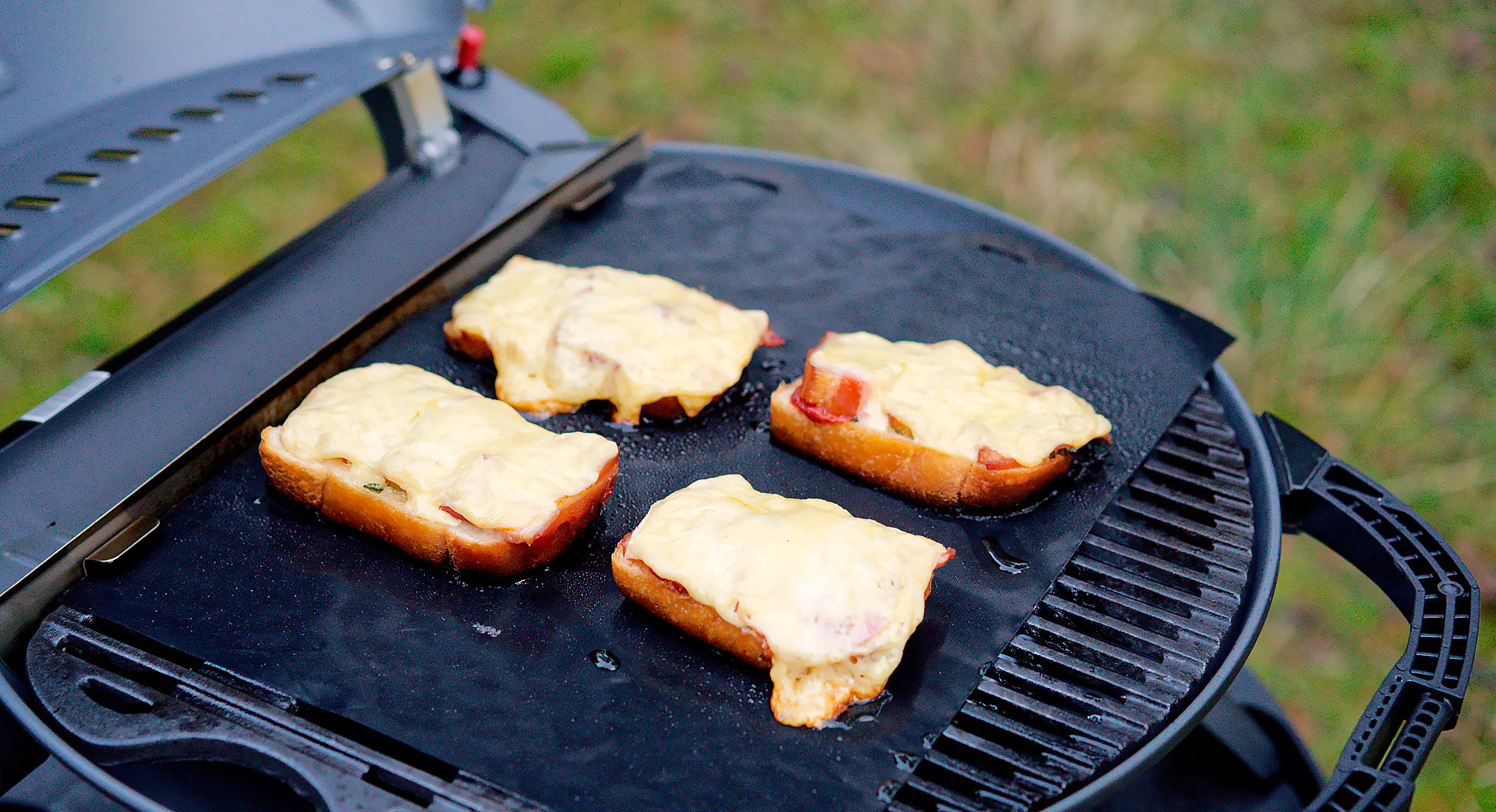 Мы разогрели гриль до 220 °C под крышкой, поместили коврик и бутерброды следующей конструкции: пшеничный хлеб, сливочное масло, зеленый лук, томатный соус, ветчина, кусочек свежего помидора и сыр. Чтобы было вкусно, нужно брать хороший хлеб, масло, соус, ветчину и сыр, не скупясь и не пытаясь упихать в это чудесное блюдо какие-нибудь непристроенные остатки.