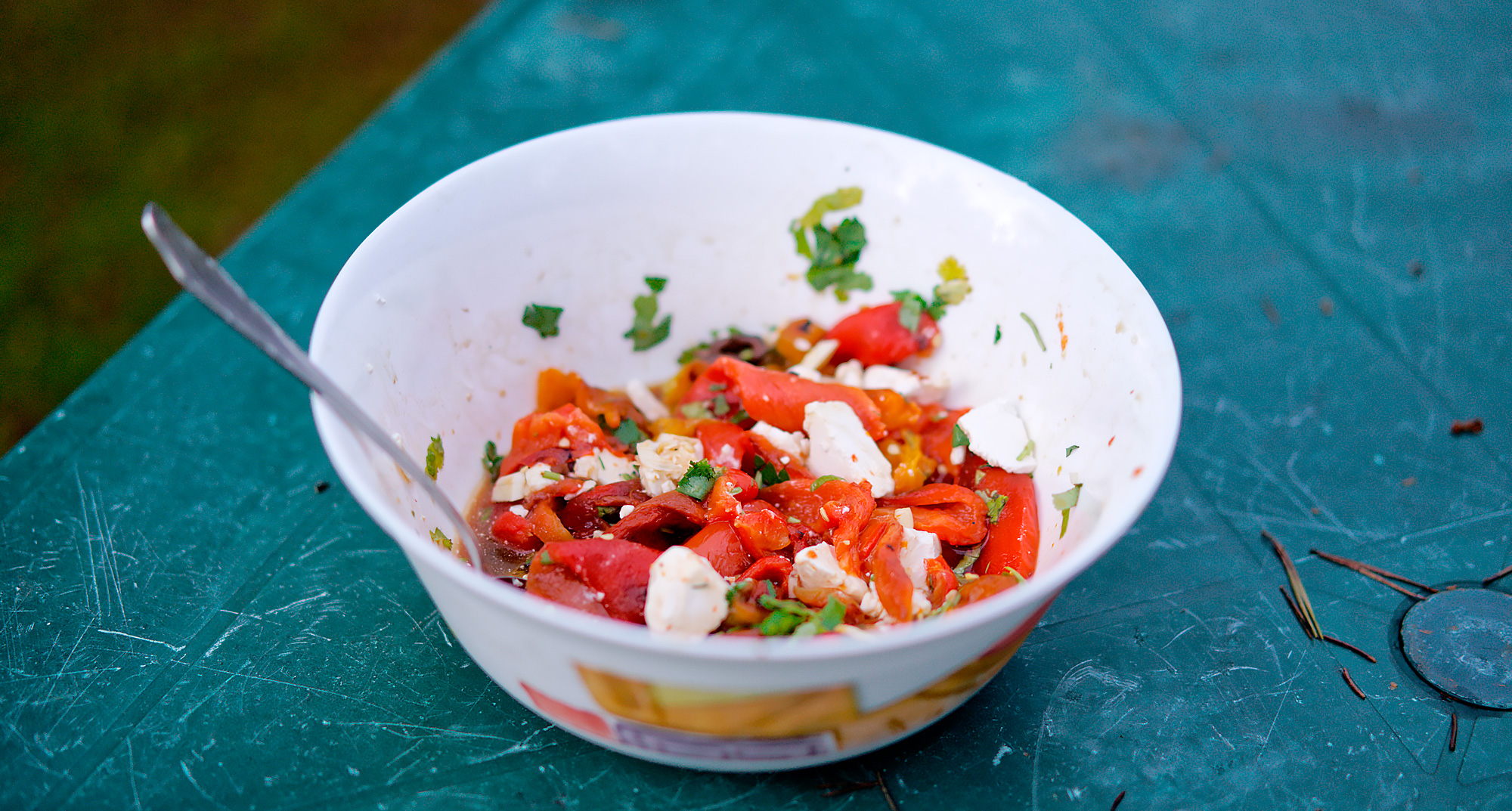 Далее экспериментируем с высоким нагревом. Перцы нужно запечь до обугливания кожицы, чем мы и занялись. Баллончик все тот же — маленький туристический. Делать точные замеры бессмысленно, но для ориентира будет полезно знать, что его хватило на четыре полноценных блюда и внутри еще плескалось содержимое. Получается, что цанговый баллон в день — максимальный расход на компанию из 4-6 человек, и если вам лень таскать в багажнике большой газовый баллон, на эту цифру и надо ориентироваться.