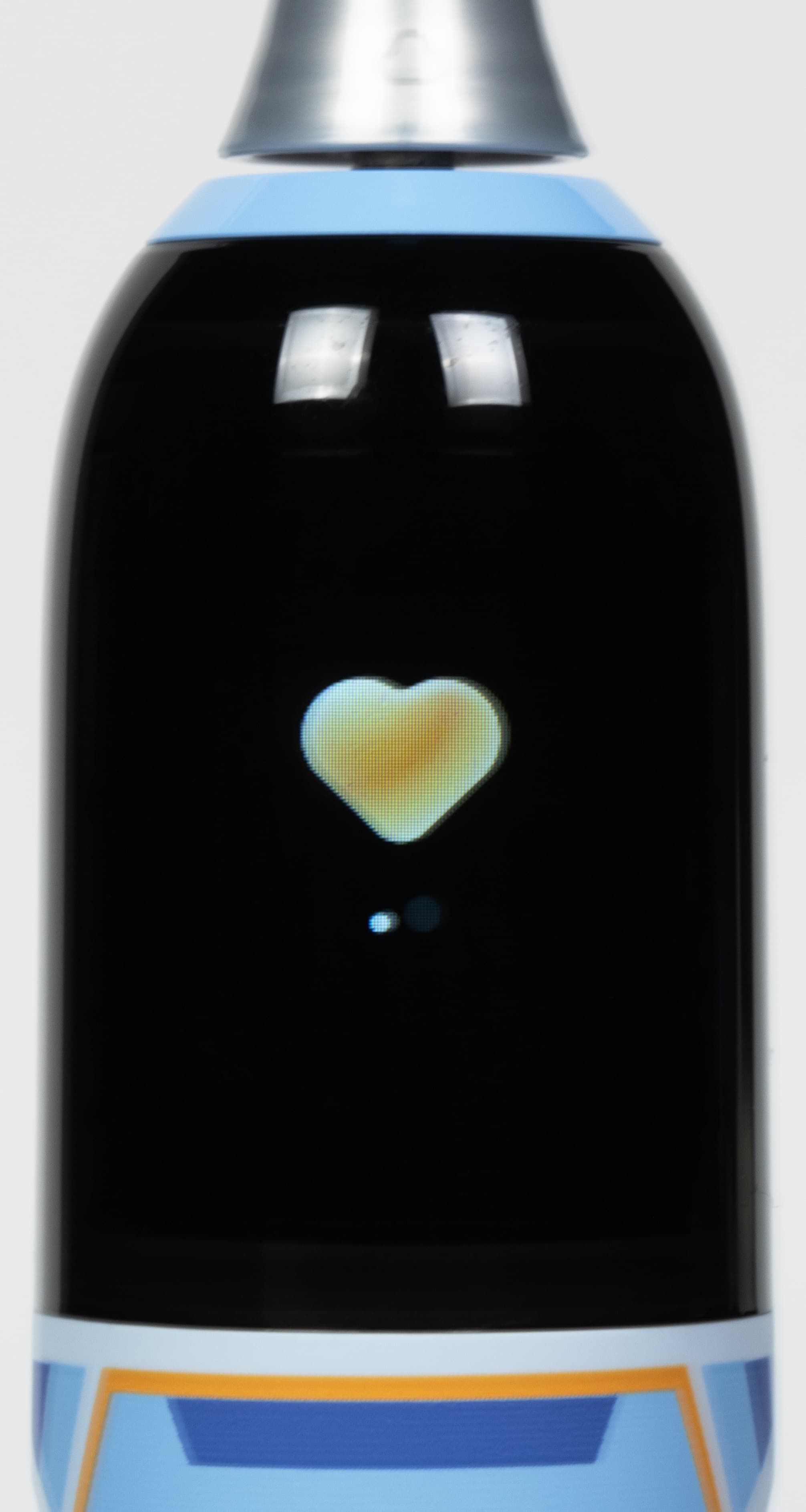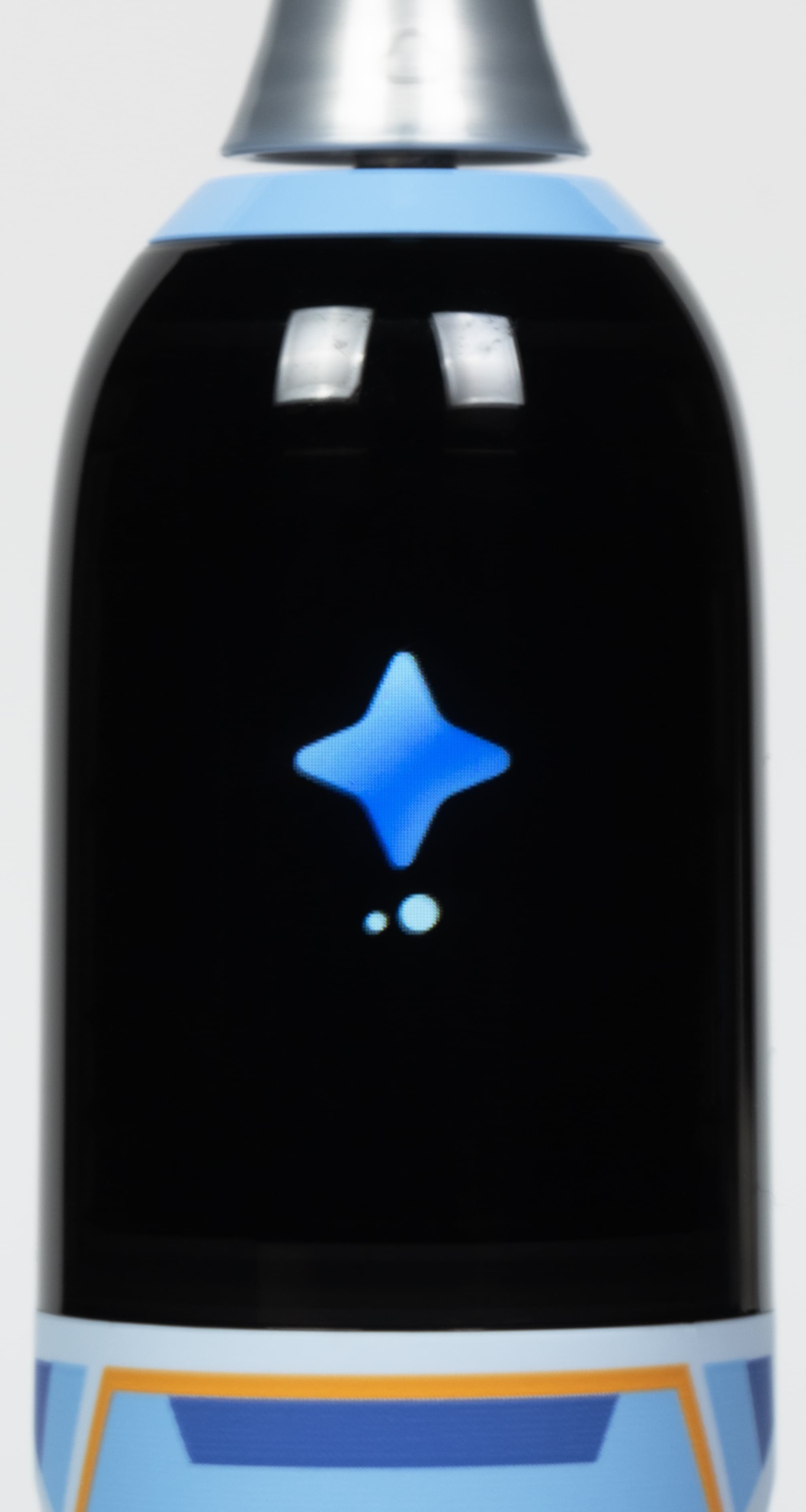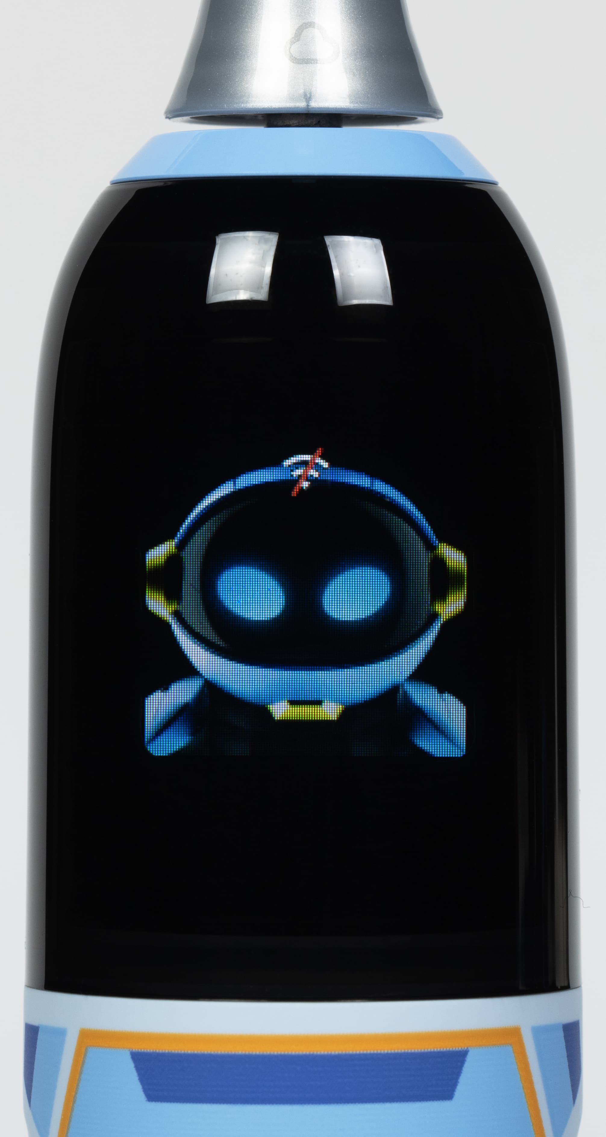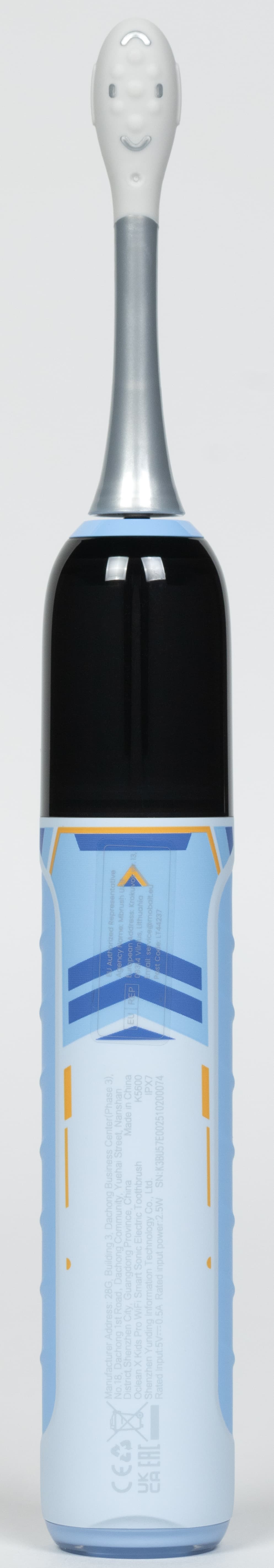 Управление зубной щеткой Oclean X Kids Pro происходит при нажатии на единственную имеющуюся на корпусе кнопку. На фото ниже смешная рожица инопланетянина (?), также виден значок Wi-Fi, пока еще не подключенного.