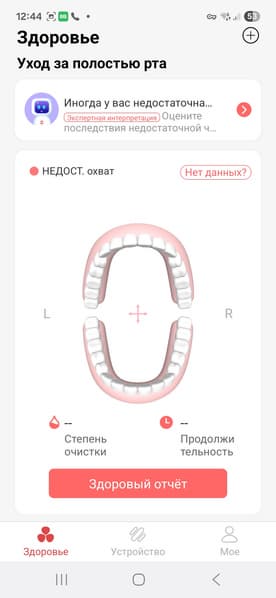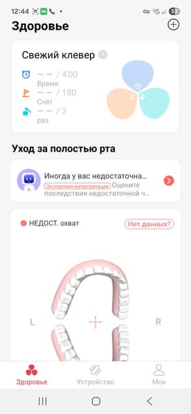 В разделе «Здоровье» можно отслеживать уход за полостью рта. «Свежий клевер» поможет проверить время, потраченное на чистку зубов, степень очистки, которая суммируется по всем чисткам за день, и количество чисток в день. Здесь же можно увидеть, насколько хорошо почищены зубы, с цветным выделением плохо почищенных областей.