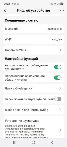 В информации об устройстве можно найти подключения к Bluetooth и Wi-Fi, настроить функции, такие как автоматическое пробуждение зубной щетки (как только ее берешь в руки), напоминание об изменении области чистки, выбор языка (один из 34, представленных в инструкции), переключить звук и выбрать песню для чистки зубов.
