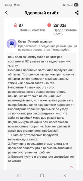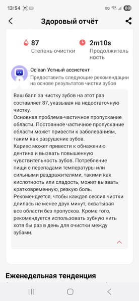«Здоровый отчет» показывает степень очистки зубов и продолжительность чистки в еженедельном разрезе, а умный ассистент Oclean дает рекомендации по чистке.