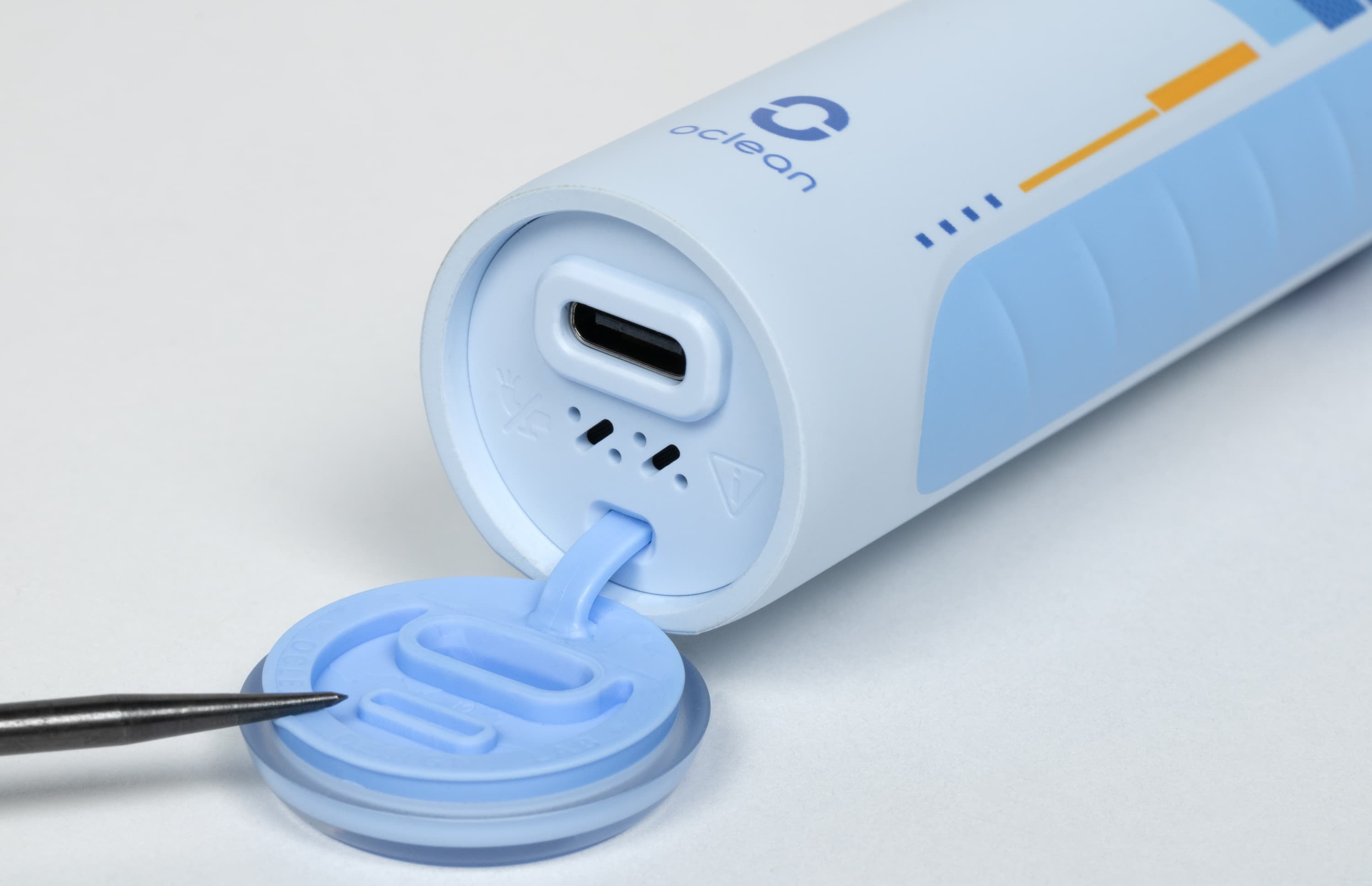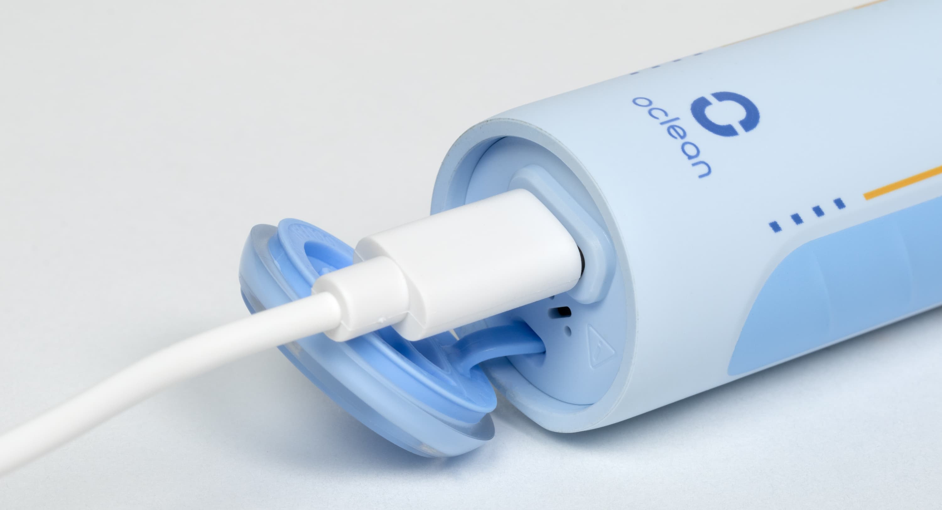 Нижняя поверхность щетки закрыта крышкой, защищающей гнездо подключения зарядного кабеля от влаги.