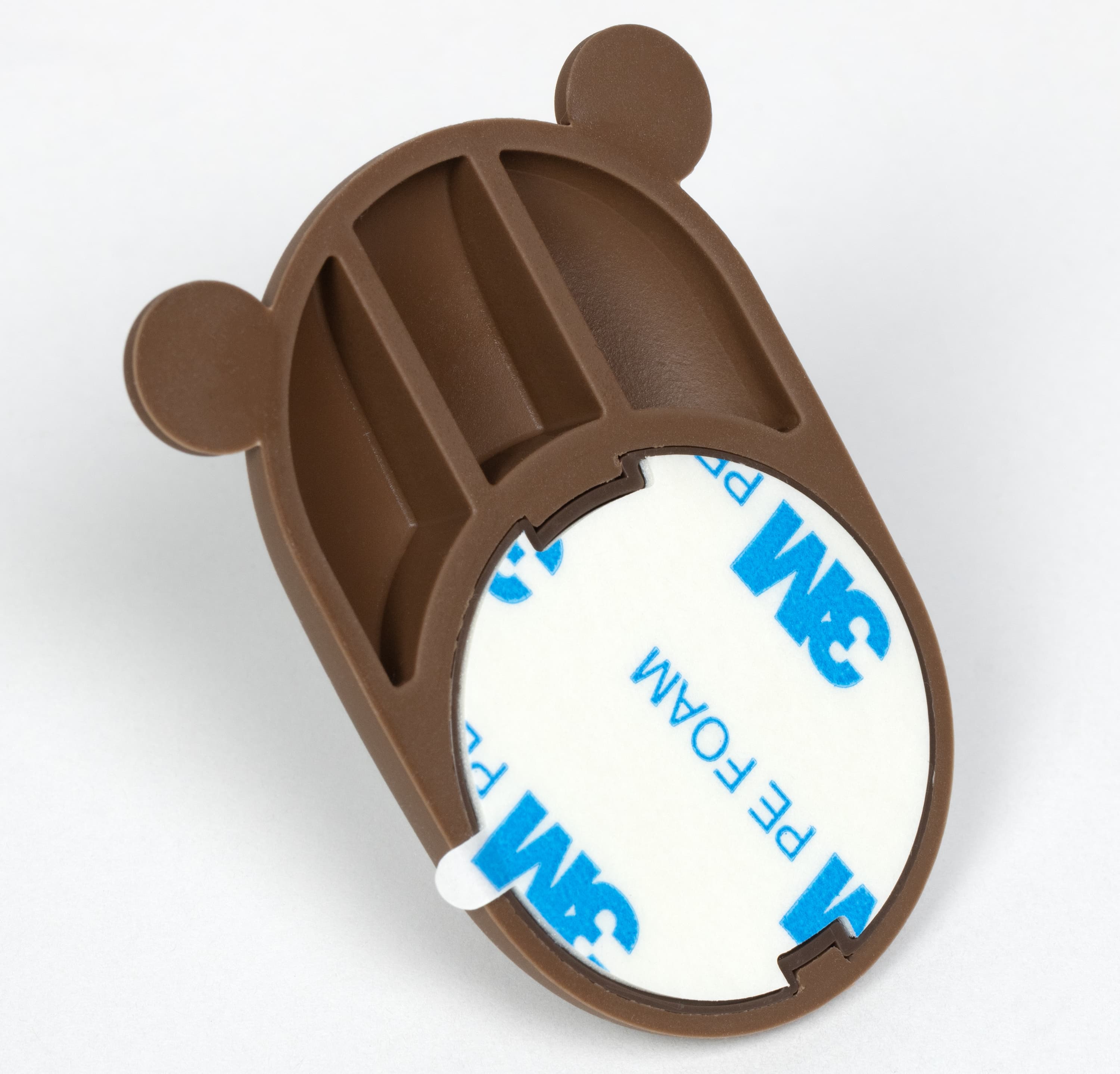 На оборотной стороне держателя — липкая поверхность, благодаря которой можно прикрепить держатель на стену или в любое другое удобное место.