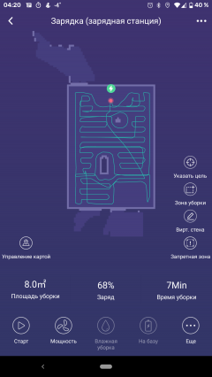 Интерфейс главного экрана очень напоминает аналогичное приложение пылесоса 360 S7, который мы рассматривали не так давно: те же самые кнопки управления режимами работы робота, расположенные внизу; такие же индикаторы площади уборки, состояния аккумулятора и продолжительности работы. Инструменты редактирования карты, которые позволяют установить зоны уборки, запретные зоны, виртуальные стены и точки локальной уборки, размещены в правой части экрана.