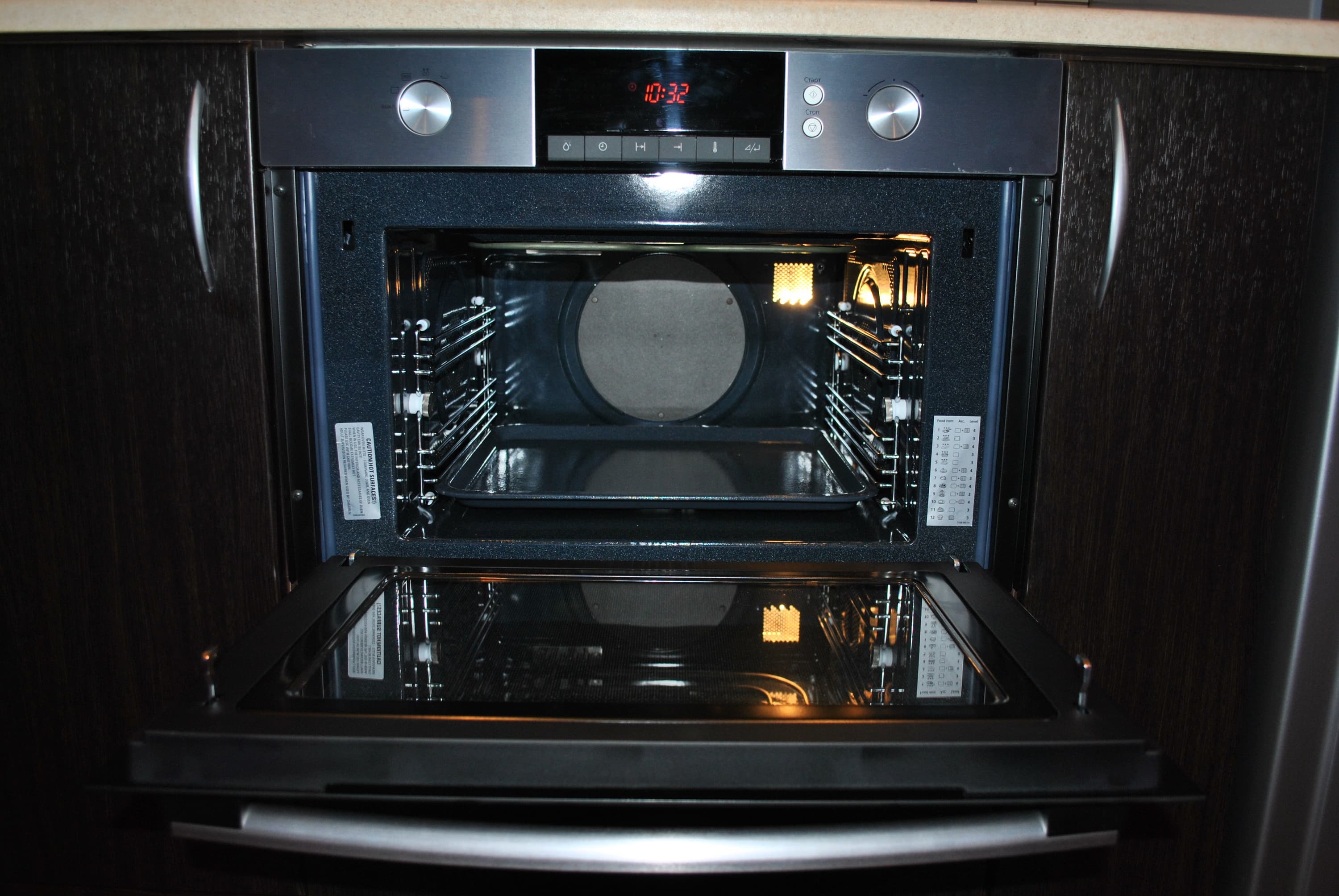 Некоторые модели духовых шкафов по совместительству могут выполнять функцию микроволновой печи. Такое решение хоть и существенно повлияет на стоимость устройства, но в перспективе позволит сэкономить место на кухне. Более того: такую духовку-микроволновку можно использовать в комбинированном режиме для ускоренного приготовления продукта.