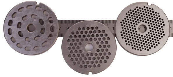 Используем среднюю решетку. Заранее нарезаем и смешиваем куски в подходящей таре — это позволит на выходе получить равномерную смесь из говядины и свинины (тот, кто пробовал перемешать 3 кг фарша, нас поймет).