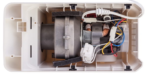 «Воздуха» внутри более чем достаточно, сборка аккуратная. Везде, где это может быть необходимо при разборке, провода можно отсоединить друг от друга, т. к. они соединены накидными клеммами (главное потом не забыть, что с чем соединять). Двигатель с редуктором от корпуса отделяют резиновые виброгасящие прокладки.