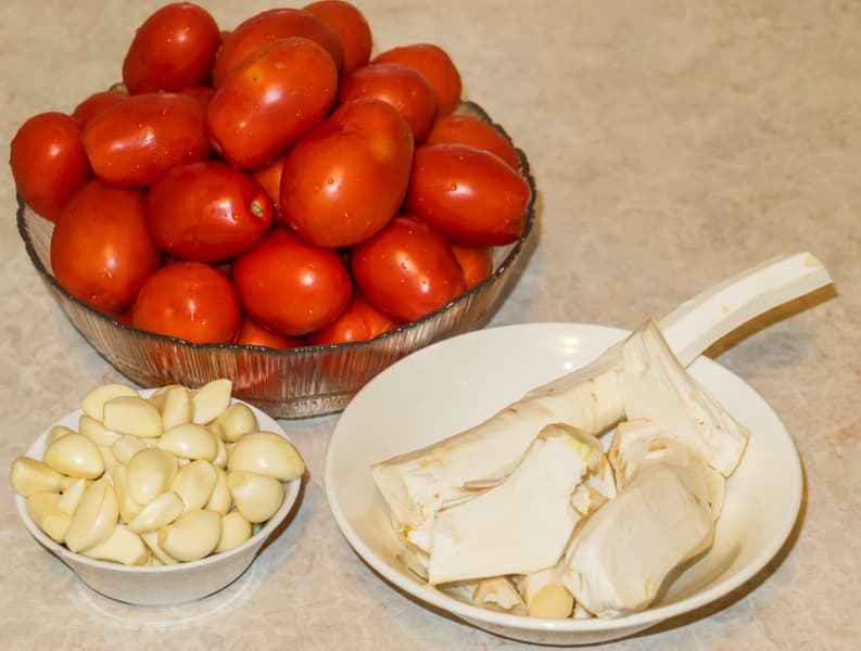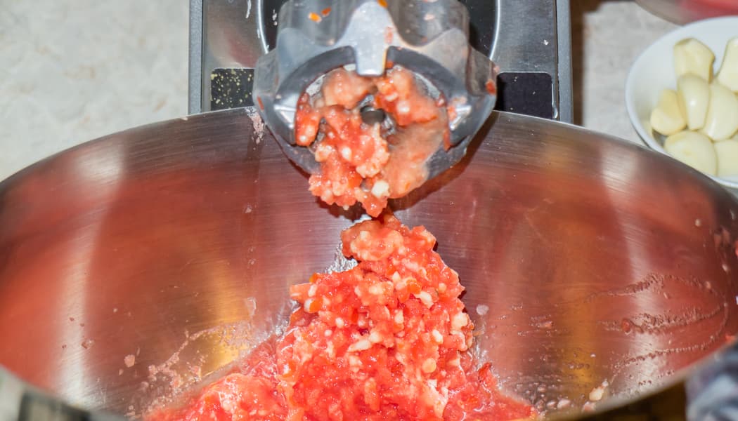 Хрен и чеснок очистили, помидоры вымыли, удалили место соединения с плодоножкой и порезали напополам. Подготовленные томаты с чесноком пропустили через мясорубку, установив решетку со средним диаметром отверстий.