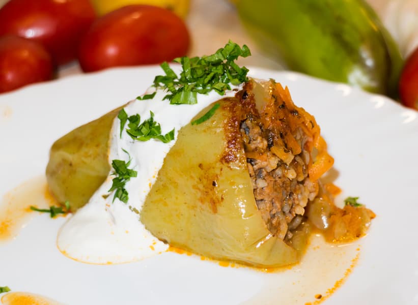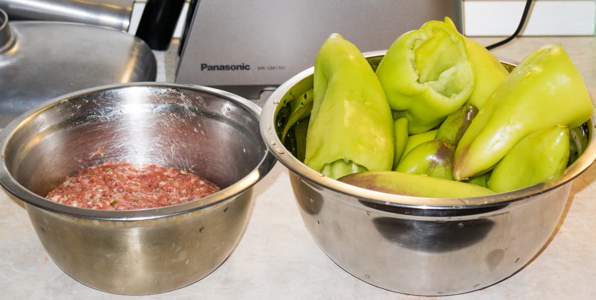 Из этого фарша было решено приготовить фаршированные перцы. Подготовили перцы, замочили рис. Затем сделали начинку из части говяжьего фарша и риса с добавлением соли, черного перца и специй.