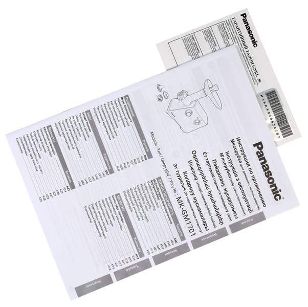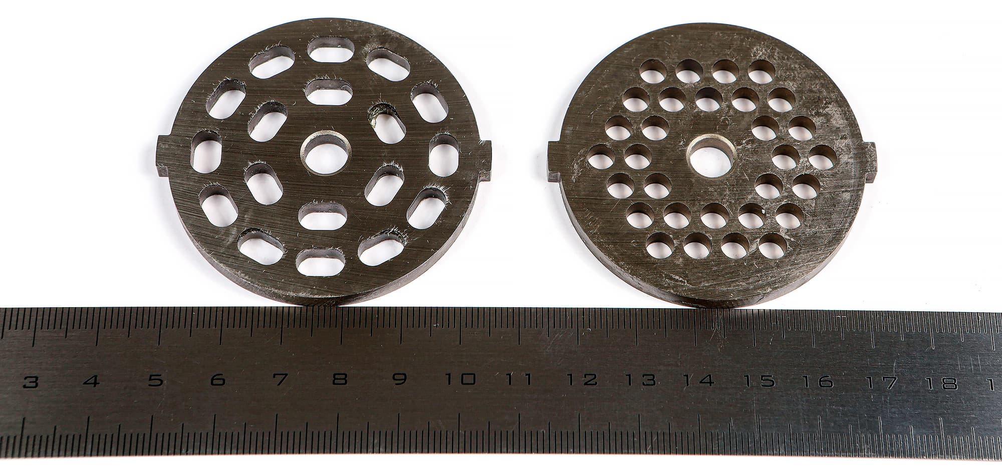 Мясорубка Panasonic MK-GM1701 укомплектована двумя перфорированными решетками: одна со средним с диаметром отверстий в 4,5 мм, вторая с крупными отверстиями овальной формы 8×5 мм. Толщина решеток 4,5 мм.