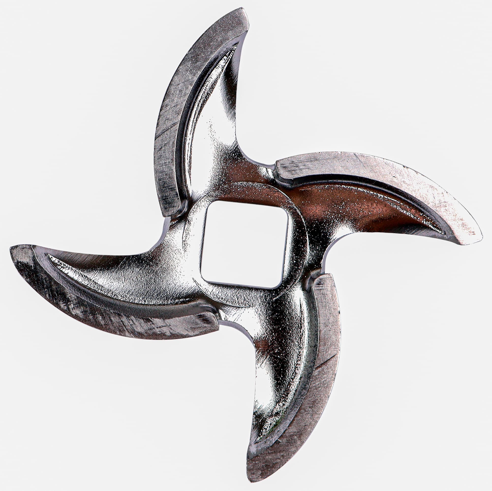 На ноже производитель делает особый акцент: оригинальная форма, превосходная заточка делают лезвия уникальными — самураи, японские мечи, древние традиции... Мы, со своей стороны, можем лишь отметить высокое качество изготовления ножа. Лезвия очень острые, так что нужно быть аккуратным при эксплуатации мясорубки, в частности, при уходе и сборке-разборке корпуса насадки.