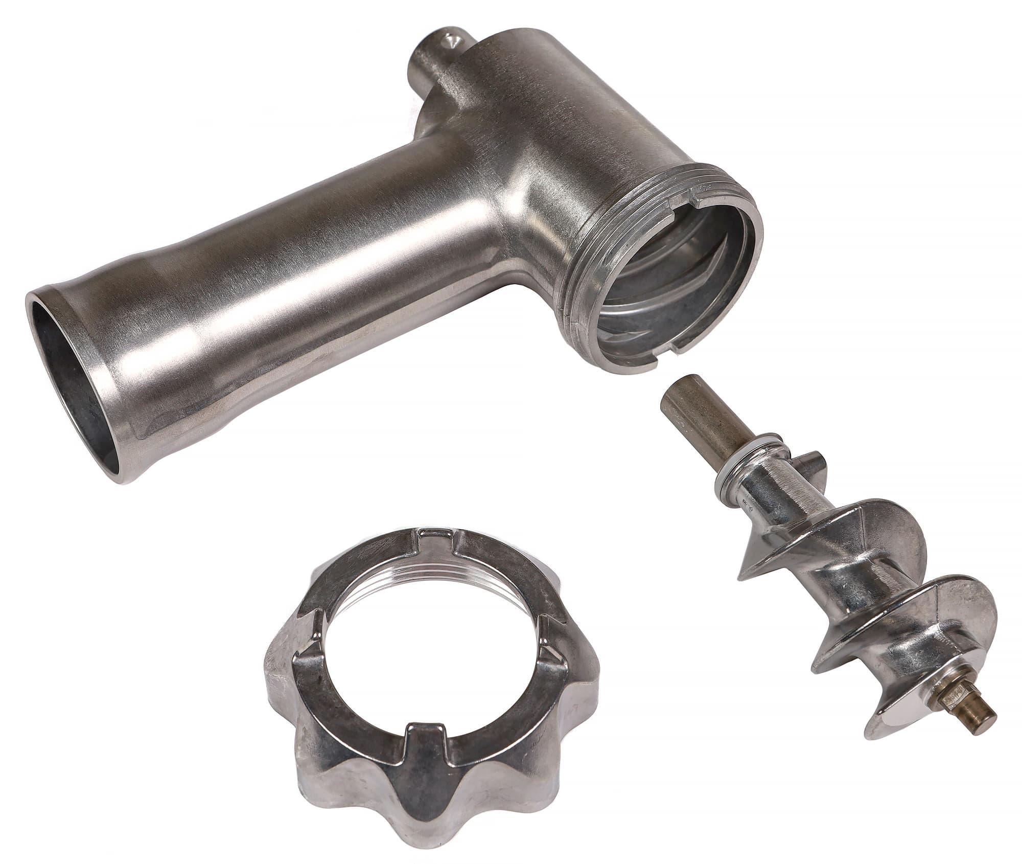- собранный блок мясорубки (съемный блок с загрузочной горловиной, шнек, нож, решетка со средним диаметром отверстий, фиксирующее кольцо),