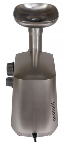 - Загрузочный лоток не фиксируется на горловине мясорубки. Однако лоток не вращался вокруг горловины даже при изготовлении кеббе, когда приходилось проталкивать готовый фарш, а не кусочки мяса. Толкатель удобный, он хорошо лежит в ладони, не вызывает излишнего напряжения при манипуляциях с ним. При рубке мяса толкателем пользовались только в том случае, если поместили в горловину много кусков. Если подавать кусочки по одному, то можно вообще обойтись без толкателя.